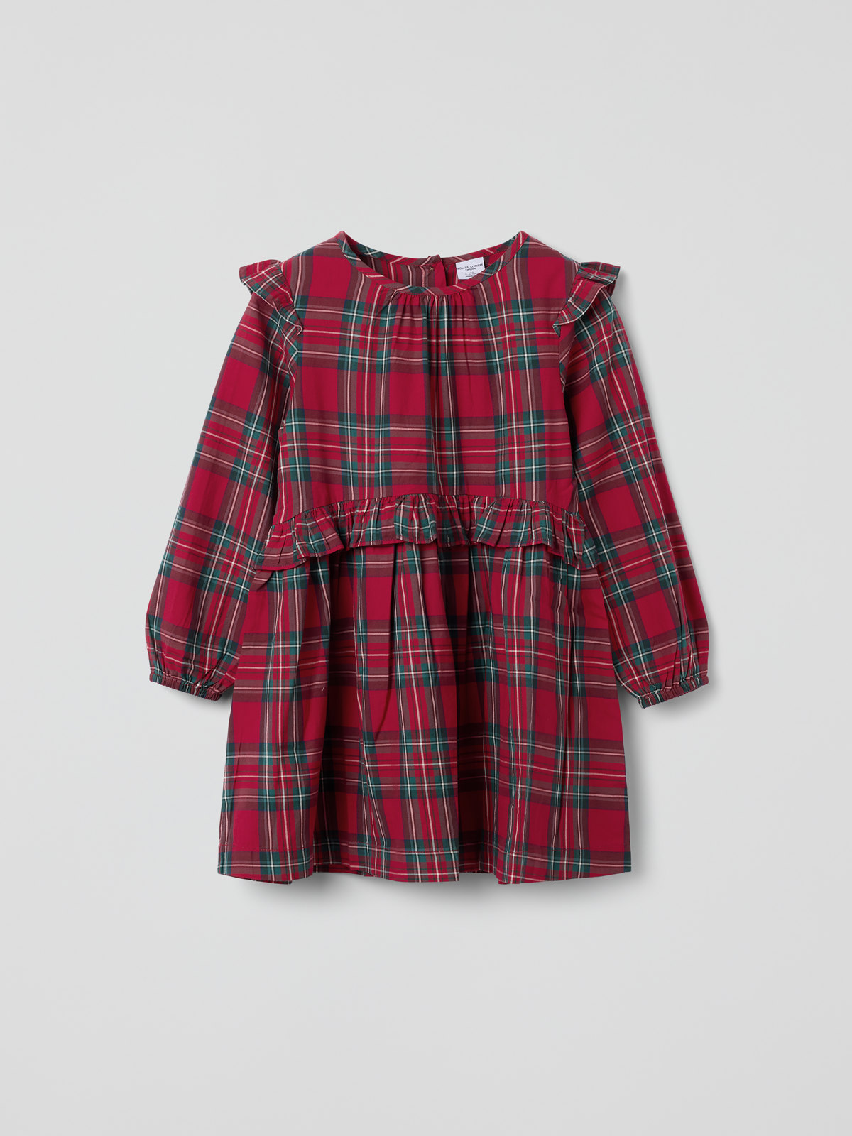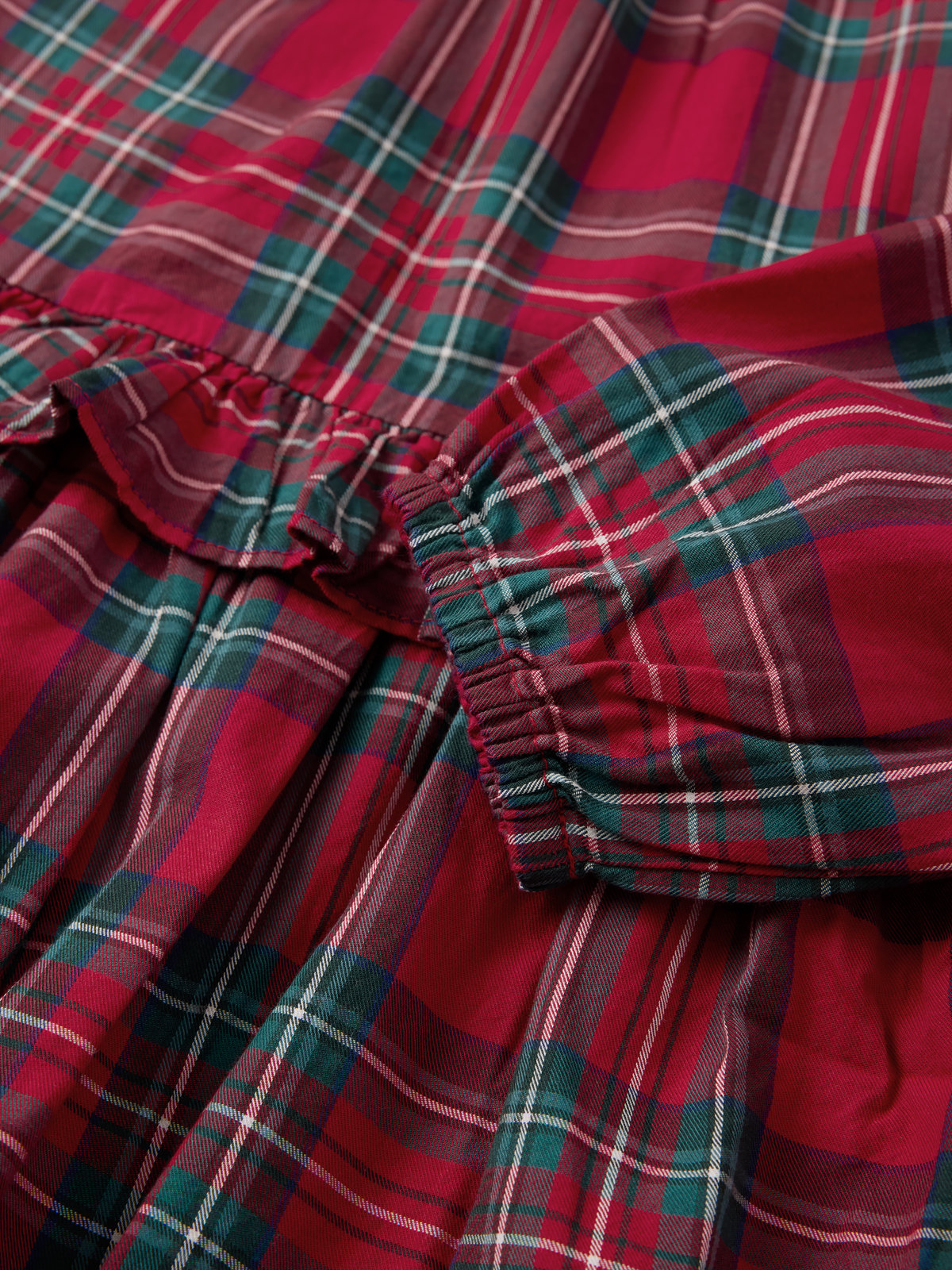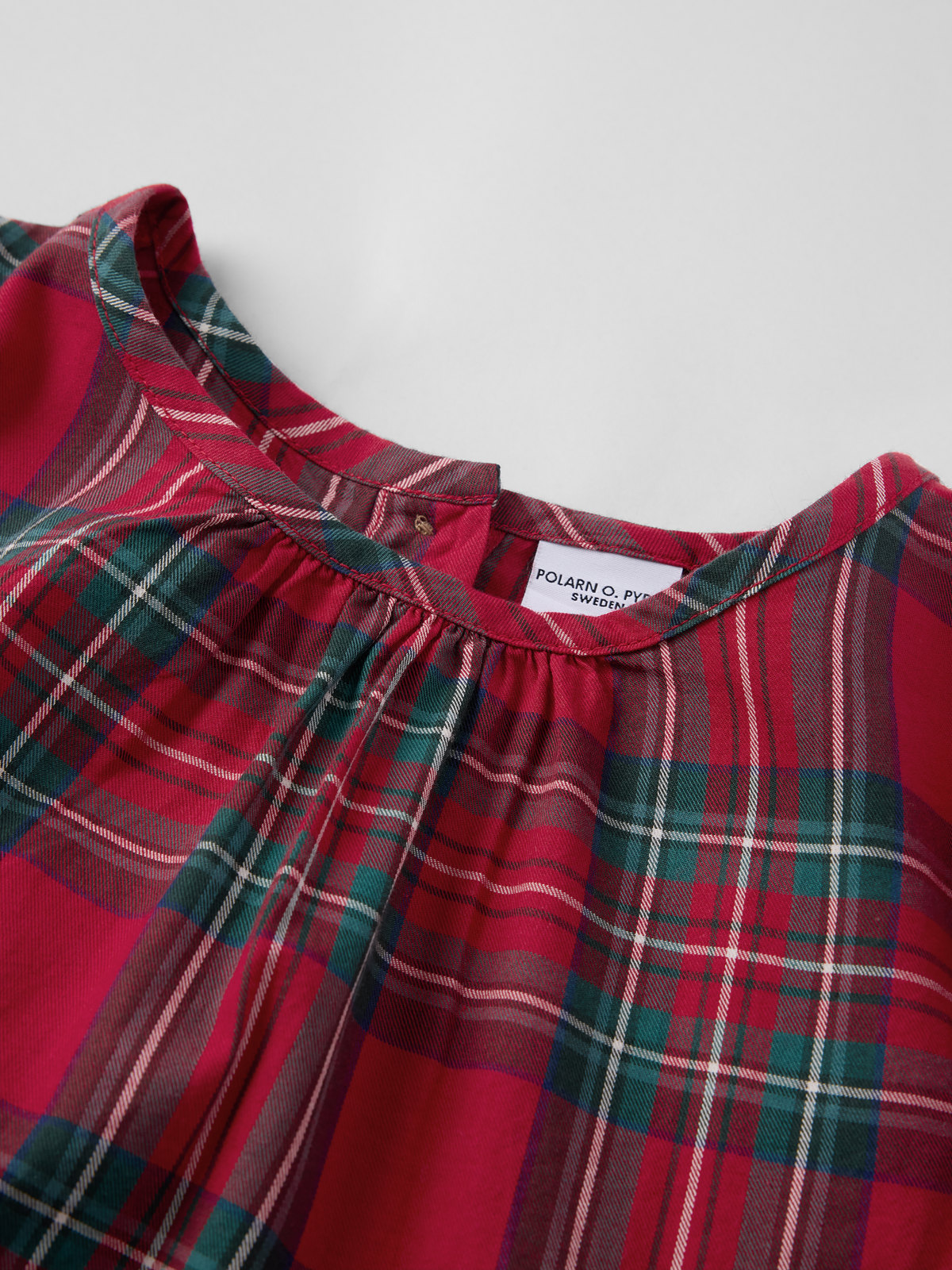 Suloinen kudottumekko 100 % luomupuuvillaa – sopii kaikkiin tilaisuuksiin! Mekossa on röyhelöitä vyötäröllä ja olkapäillä, ja se suljetaan nappilistalla takaa. Hihoissa on joustavat hihansuut.