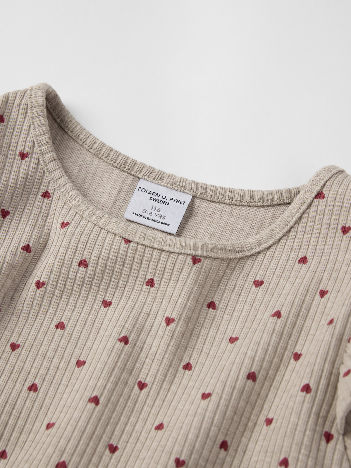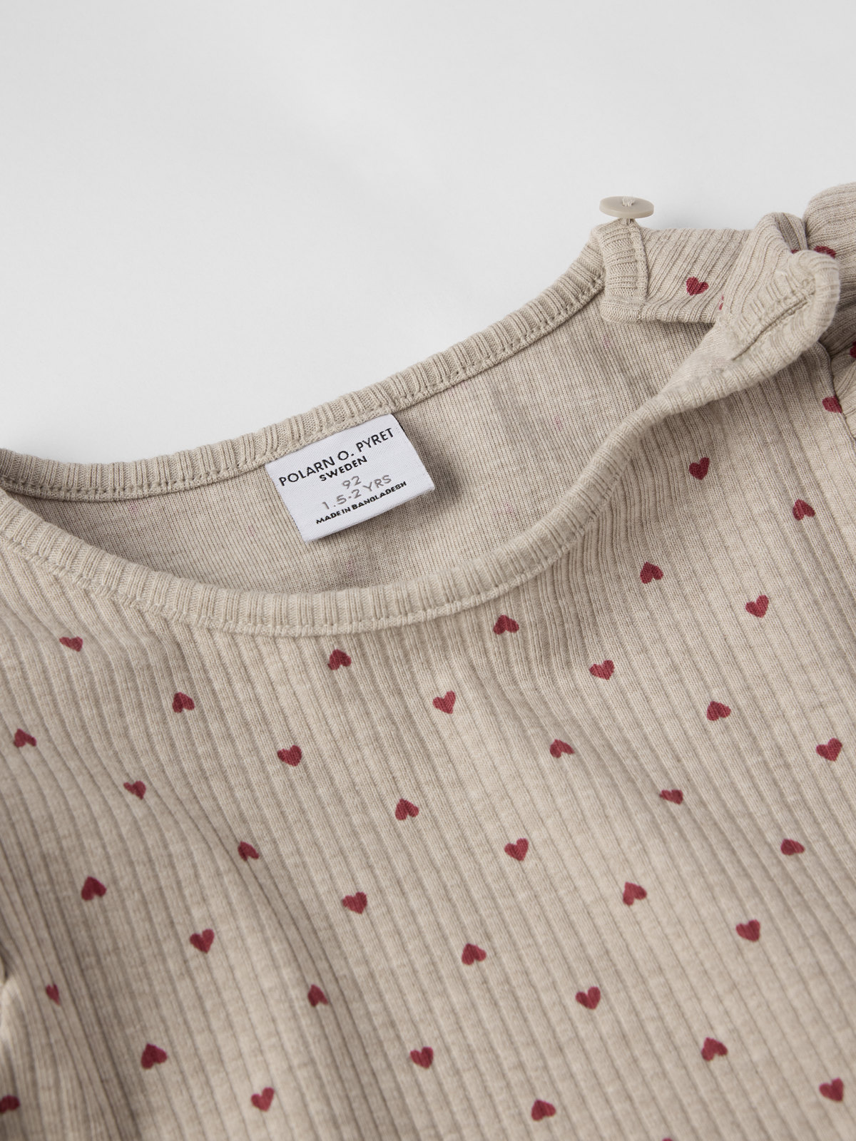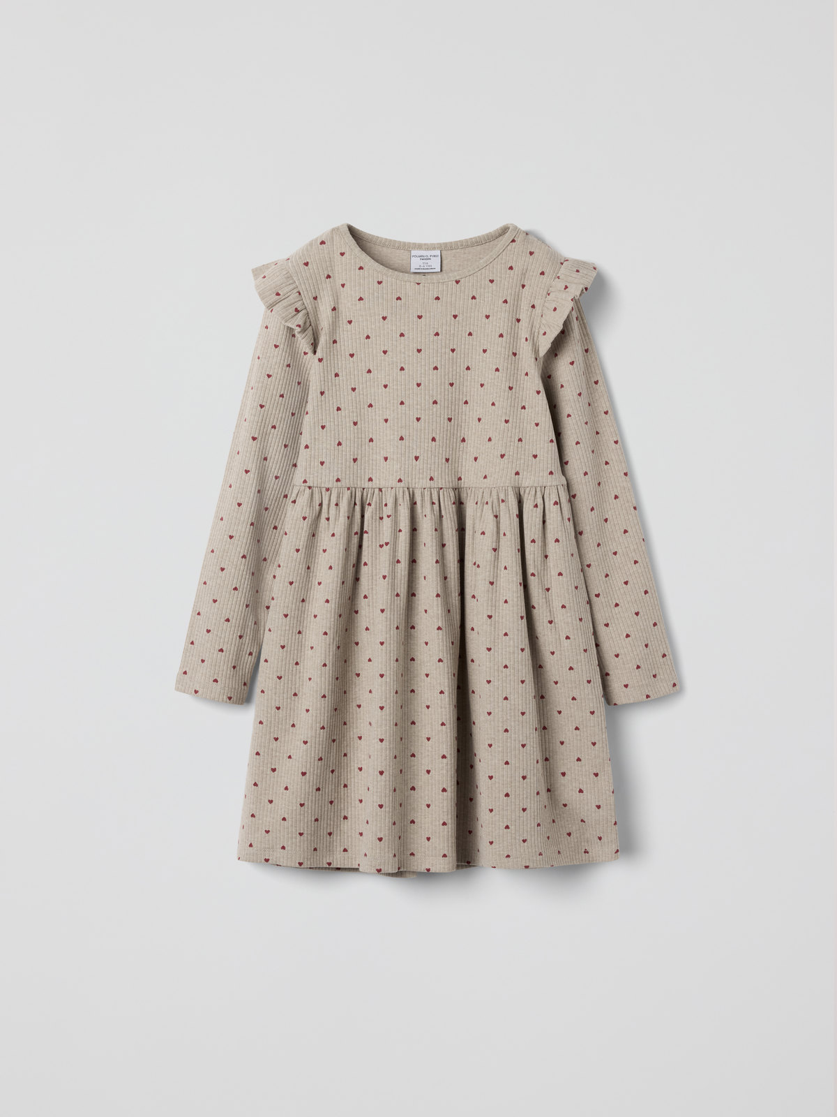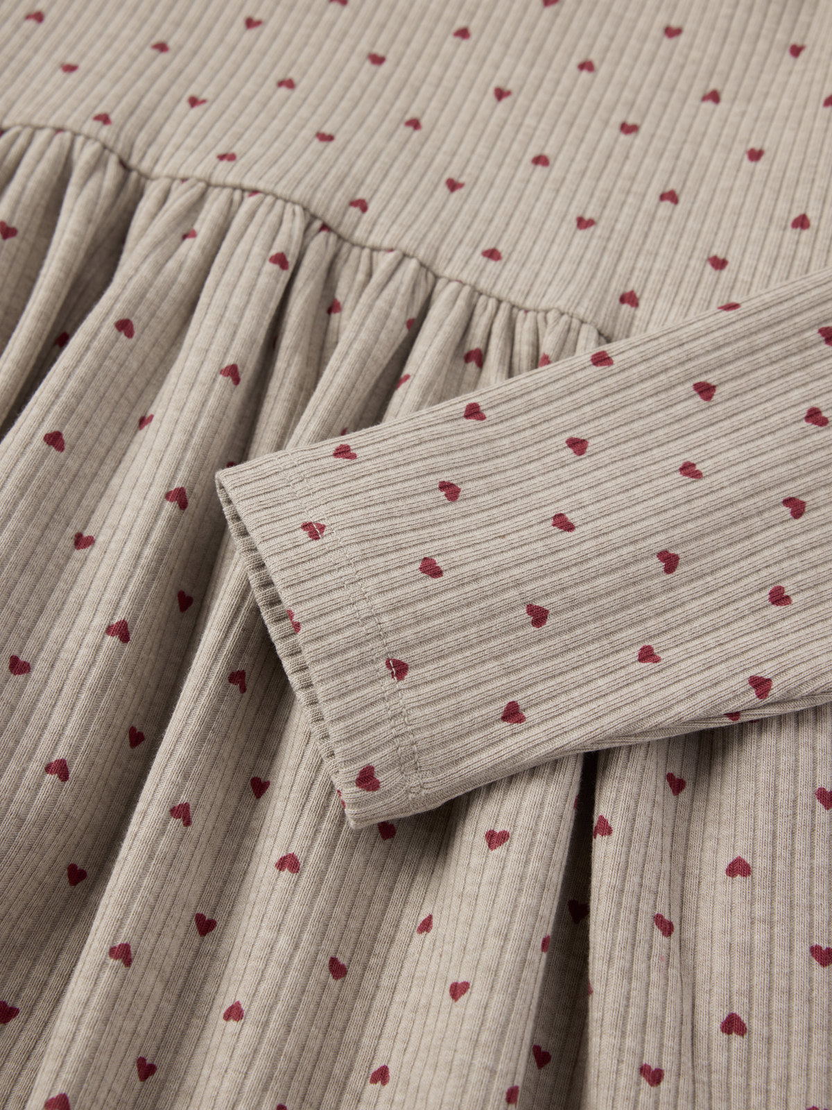 Pehmeä ribbimekko vauvalle, valmistettu luomupuuvillasta. Mekko on kuvioitu pienillä sydämillä ja olkapäillä on pienet röyhelöt.
