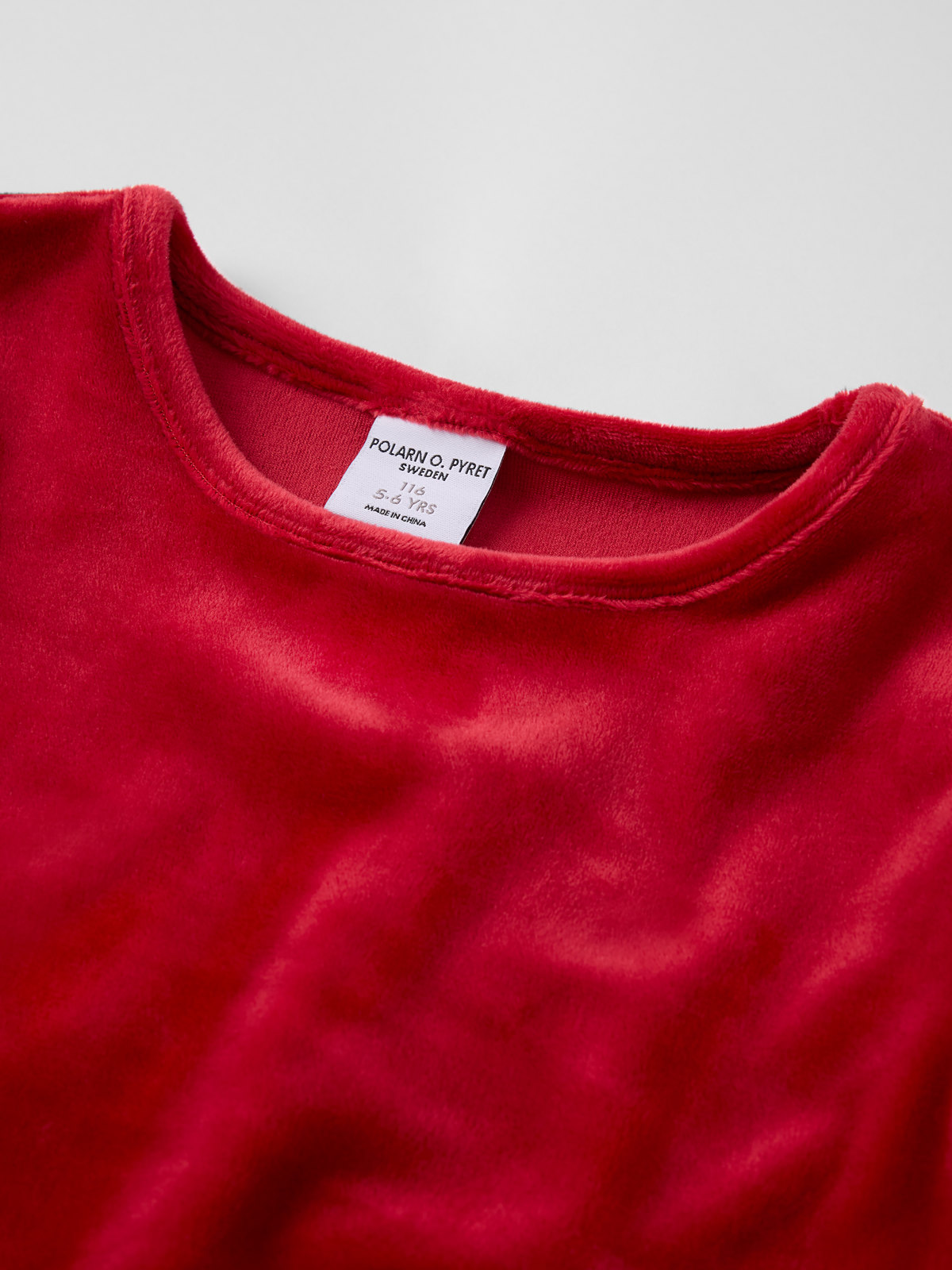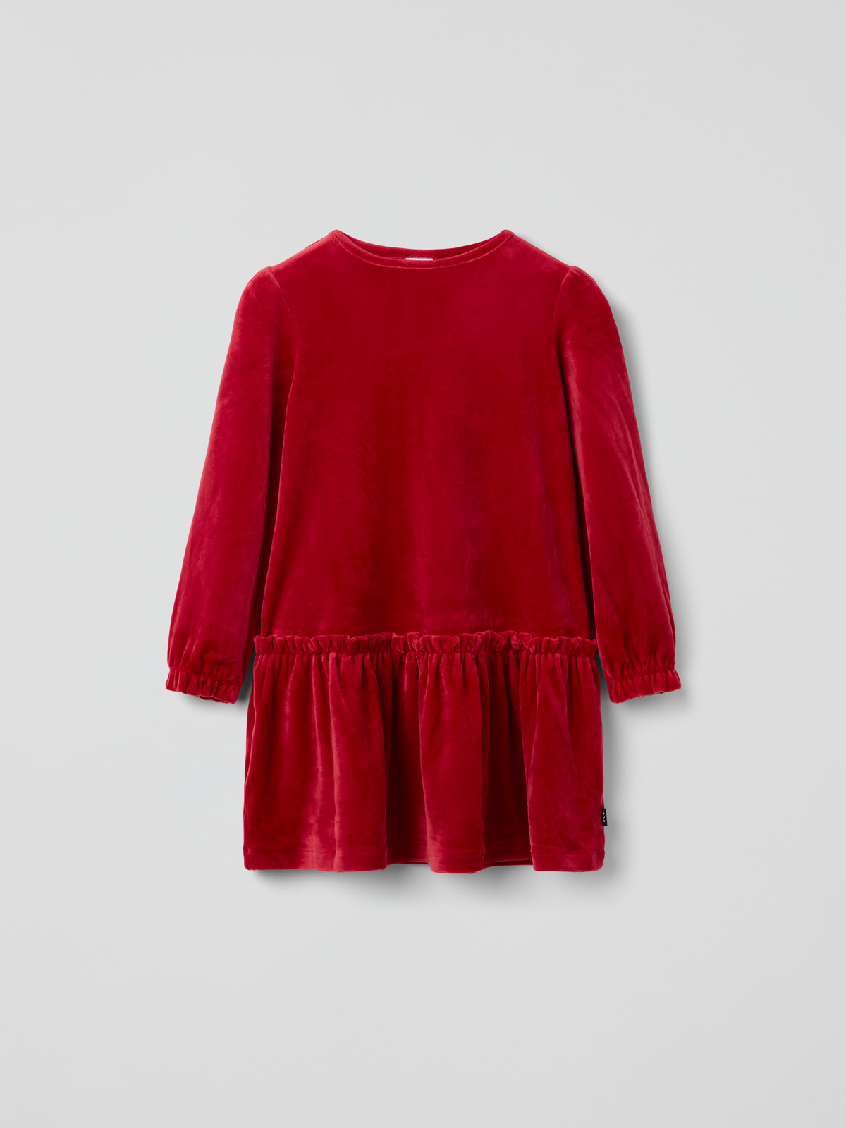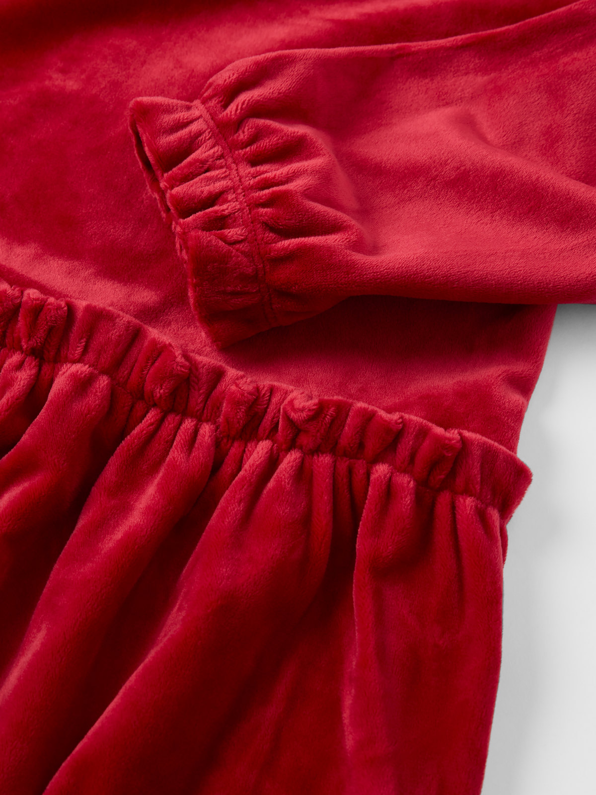 Mekko pehmeästä velourista, valmistettu kierrätetystä polyesteristä. Mekossa on matala vyötärö ja joustavat hihansuut pehmeillä rypytyksillä.