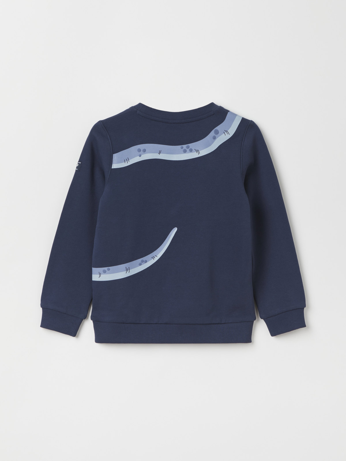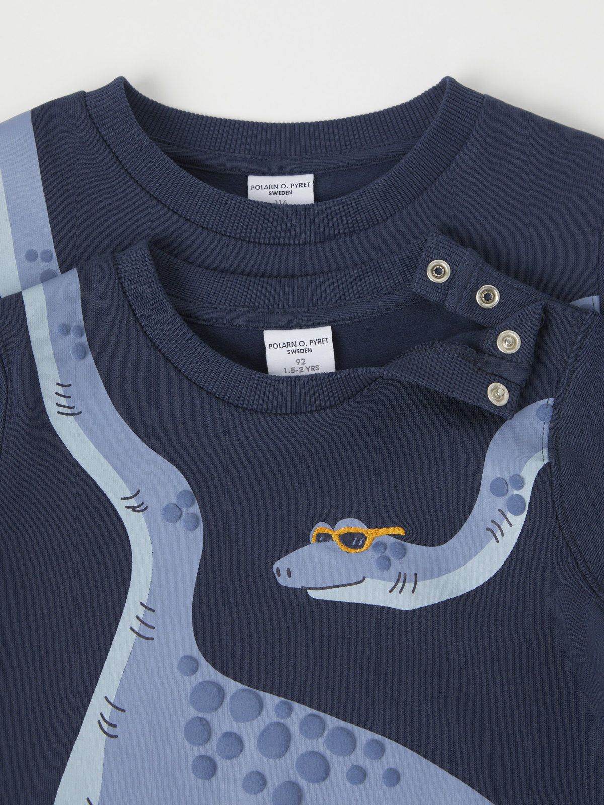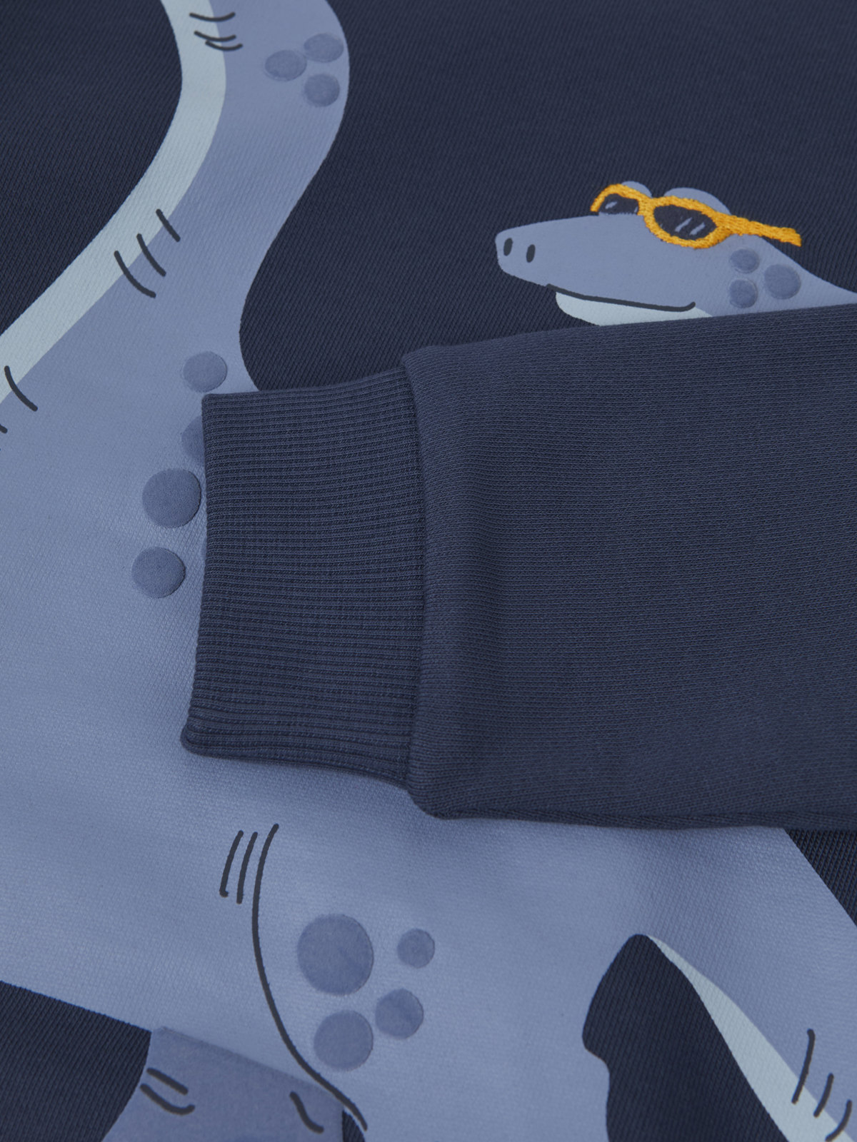 Pehmeä ja kaunis collegepaita 100 % luomupuuvillaa. Edessä iso dinosauruskuvio, joka jatkuu selässä.