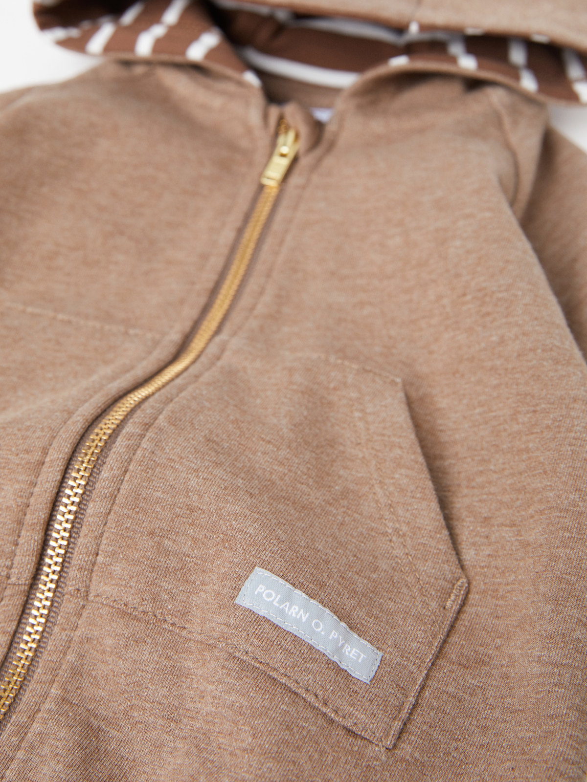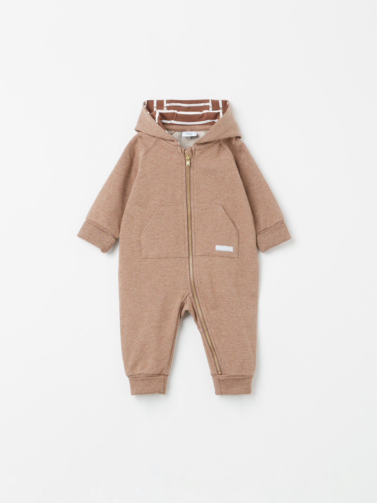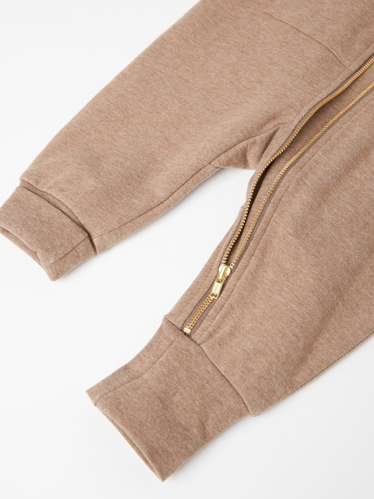 Vauvan yksivärinen haalari miellyttävää collegemateriaalia, jonka sisäpuoli on harjattu pehmeäksi. Pehmeää luomupuuvillaa. Kengurutasku. Kiinteän hupun vuori on pehmeä trikoota, jossa on klassinen raitakuosimme. Pitkä vetoketju pääntieltä lahkeensuulle helpottaa pukemista. Vetoketjussa on myös suoja, jotta se ei hankaa leukaa ja poskia. Erittäin pitkät resorit hihan- ja lahkeensuissa voi taittaa alas lapsen kasvaessa. Kokovaihtoehdoissa 80–92 on irrotettava huppu, jossa on nepparikiinnitys.