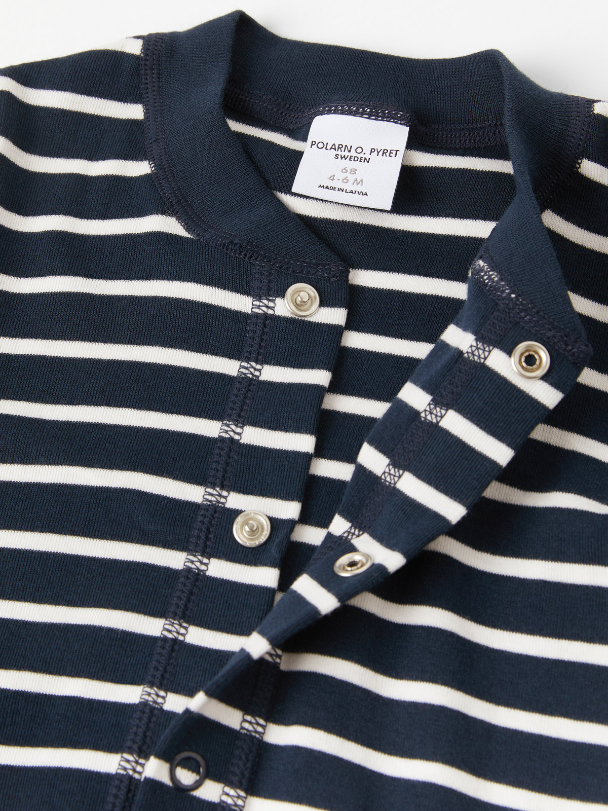 Vauvan haalari luomupuuvillaa Polarn O. Pyret -raitakuosilla. Nepparit pääntieltä lahkeensuulle helpottavat pukemista. Resorit voi taittaa alas lapsen kasvaessa.