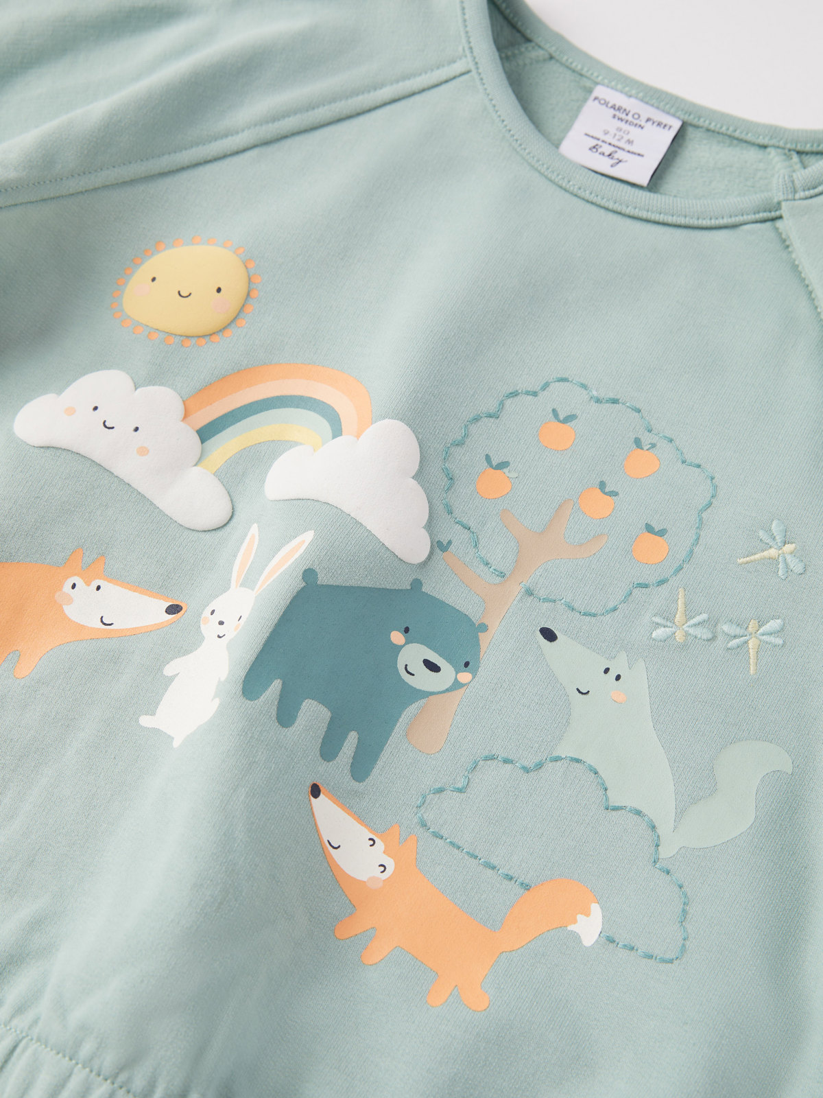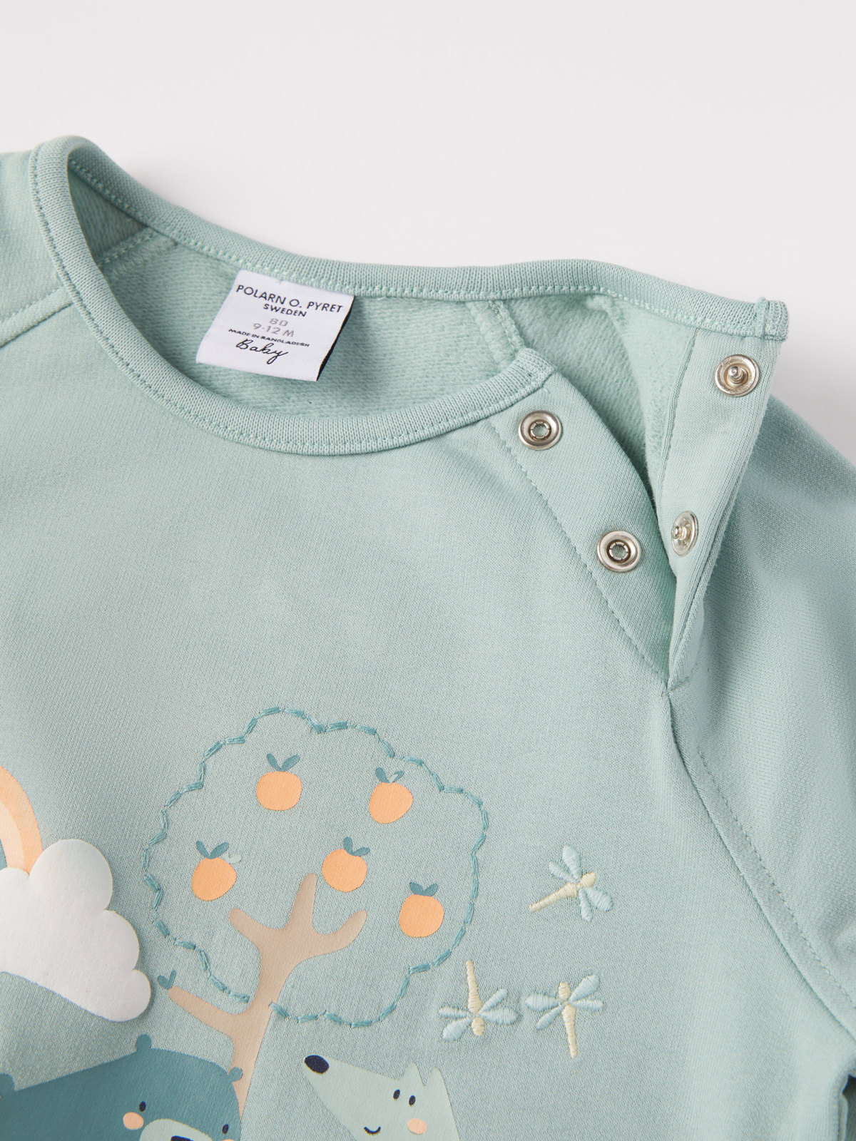 Vauvan väljä paita 100 % luomupuuvillaa. Paidassa on hieno painatus, brodeerattuja yksityiskohtia etukappaleessa ja pehmeät resorit hihansuissa.