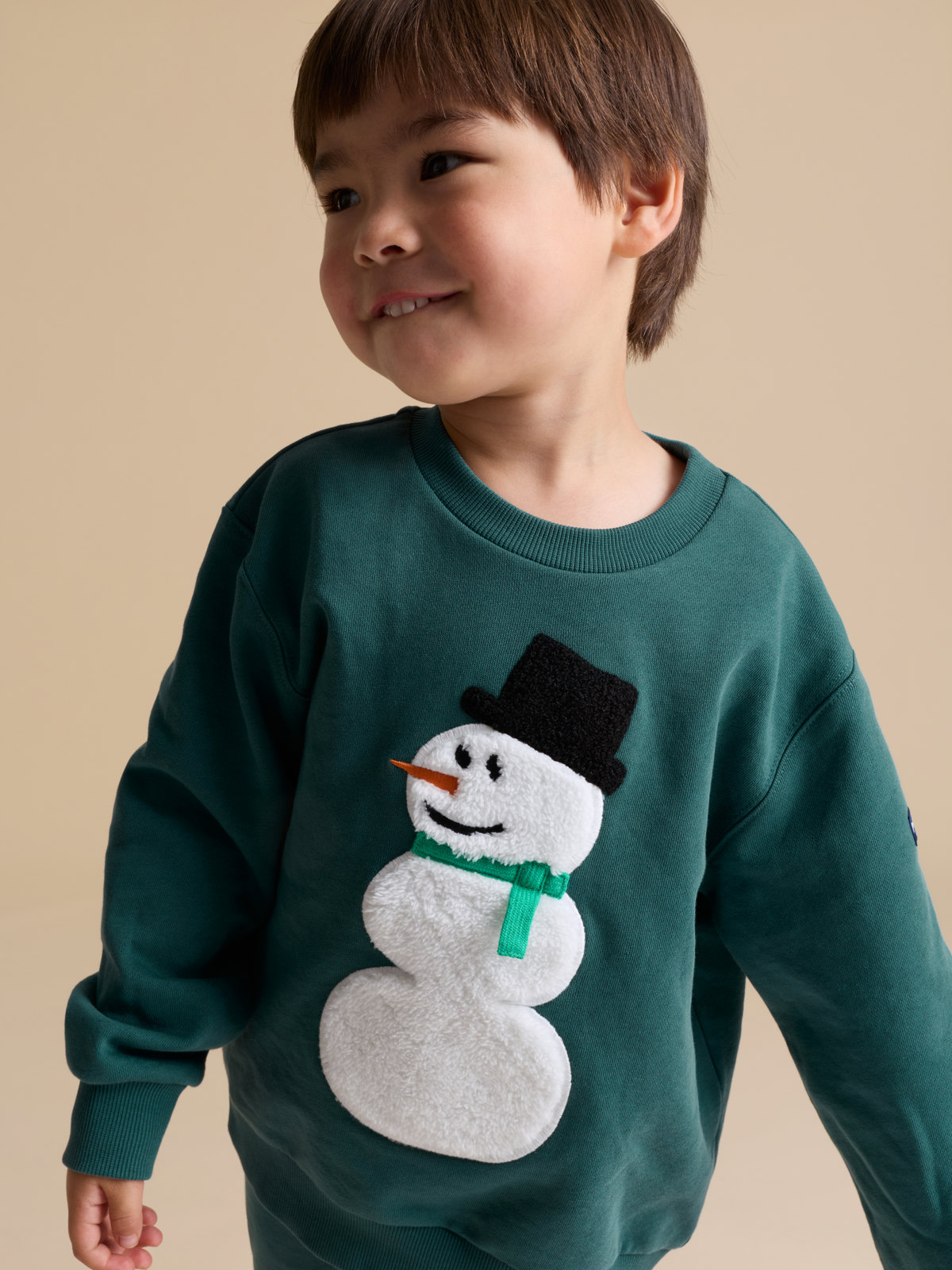Pehmeä collegepaita 100 % luomupuuvillaa. Paidassa on suuri kirjottu lumiukko edessä ja pehmeät resorit pääntiessä, hihansuissa ja helmassa mukavaa istuvuutta varten.