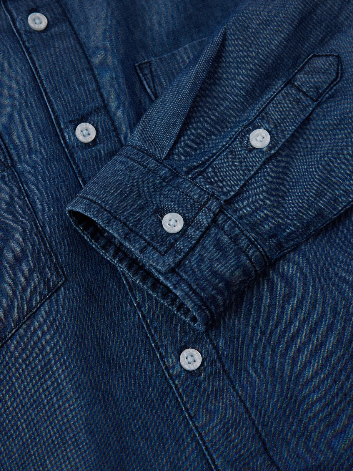 Paita ohuesta chambray-kankaasta, 100 % luomupuuvillaa – kaunis sekä arkeen että juhlaan! Paidassa on kaksi rintataskua ja napit hihansuissa.