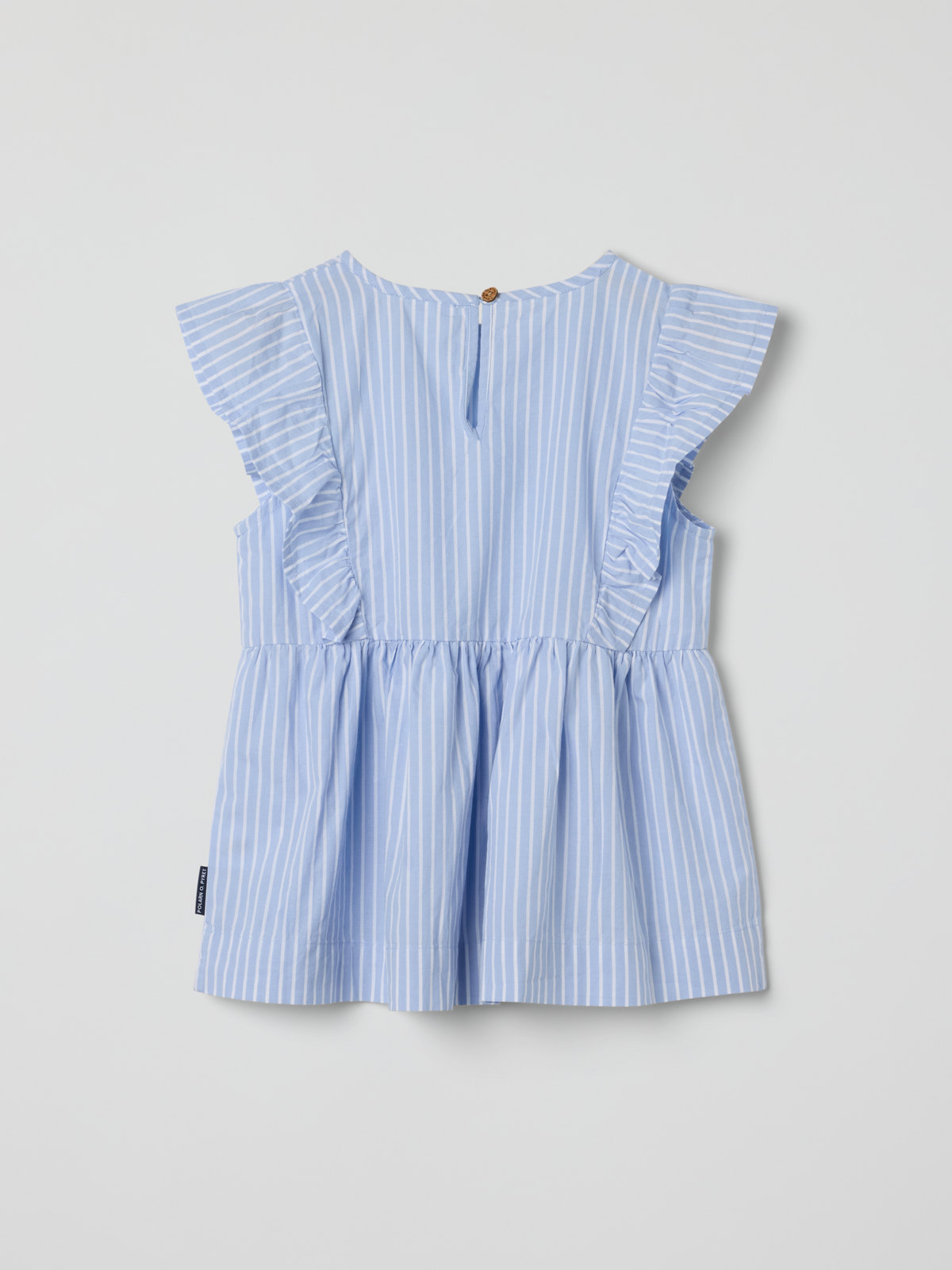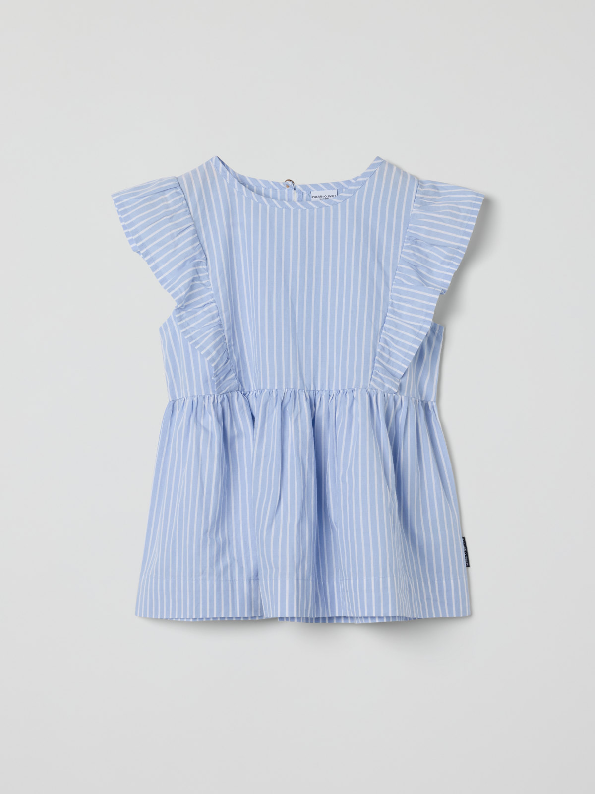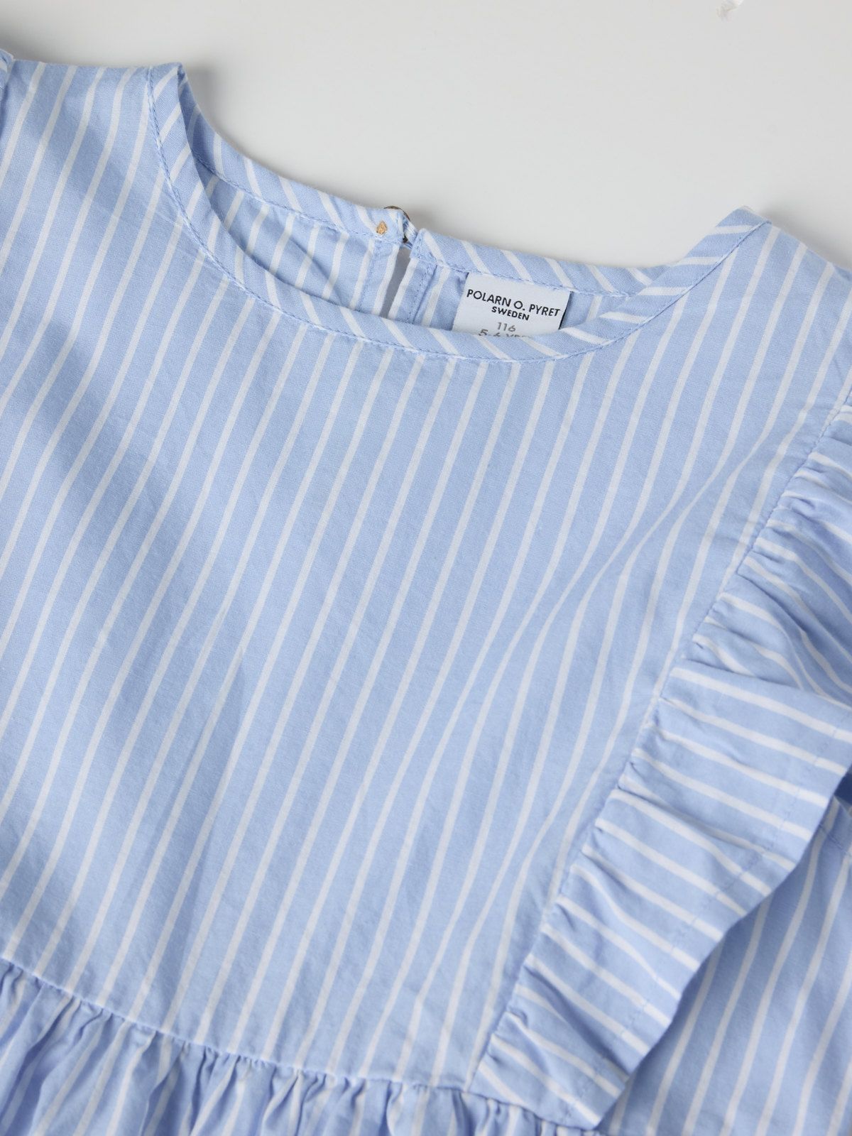 Suloinen raidallinen paita ohutta ja pehmeää luomupuuvillapopliinia – itsestään selvä valinta sekä koulun päättäjäisiin että kesäjuhliin! Paidassa on pehmeät röyhelöt olkapäillä ja kauniisti laskeutuva rypytetty helma. Napit takana.