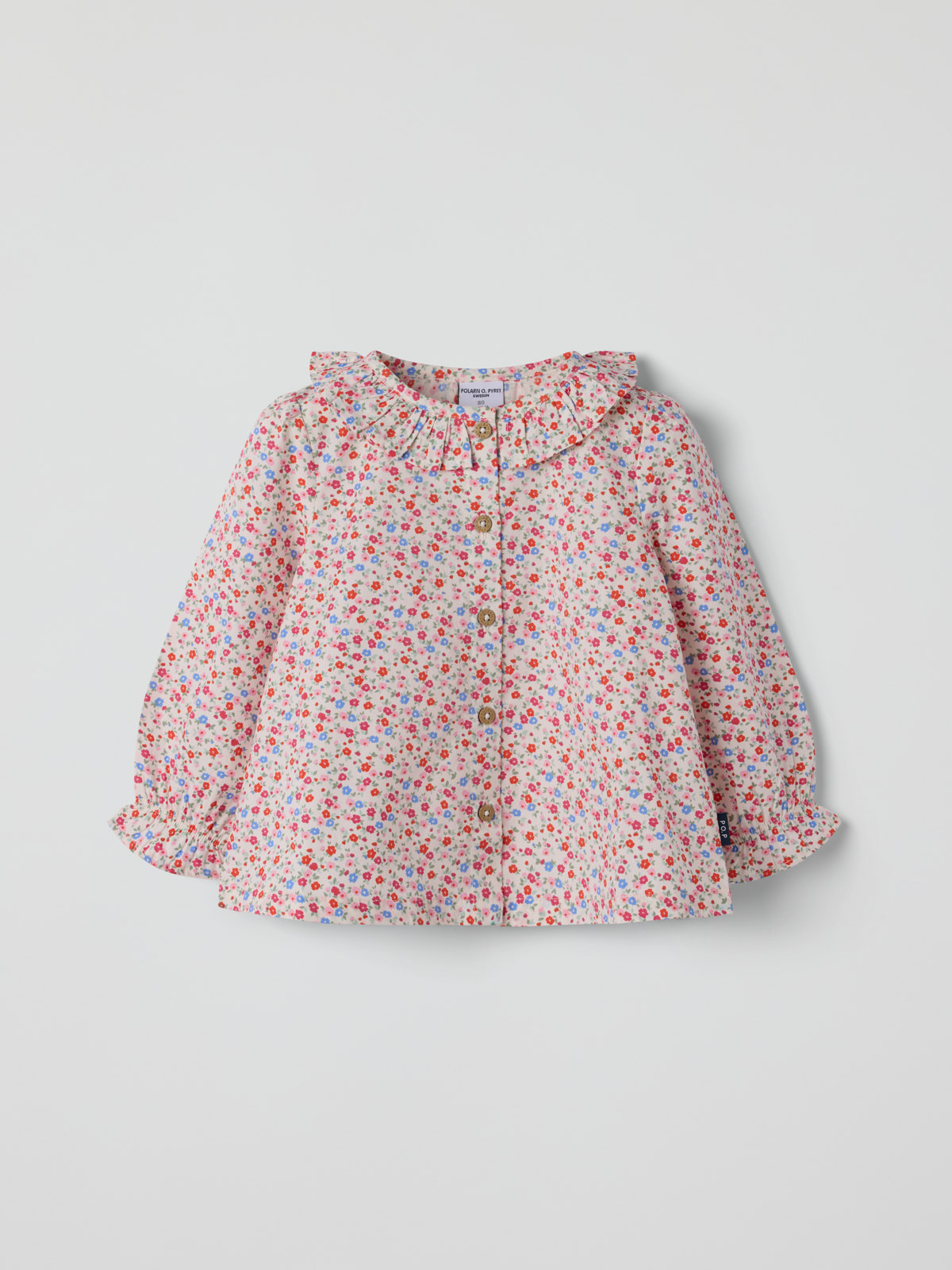 Pusero kevyestä musliinista, valmistettu 100 % luomupuuvillasta. Puserossa on rypytetty helma ja suloiset röyhelöt pääntiessä ja hihansuissa. Suljetaan edestä napeilla. Täydellinen sisarusmatchiin! musliinipusero