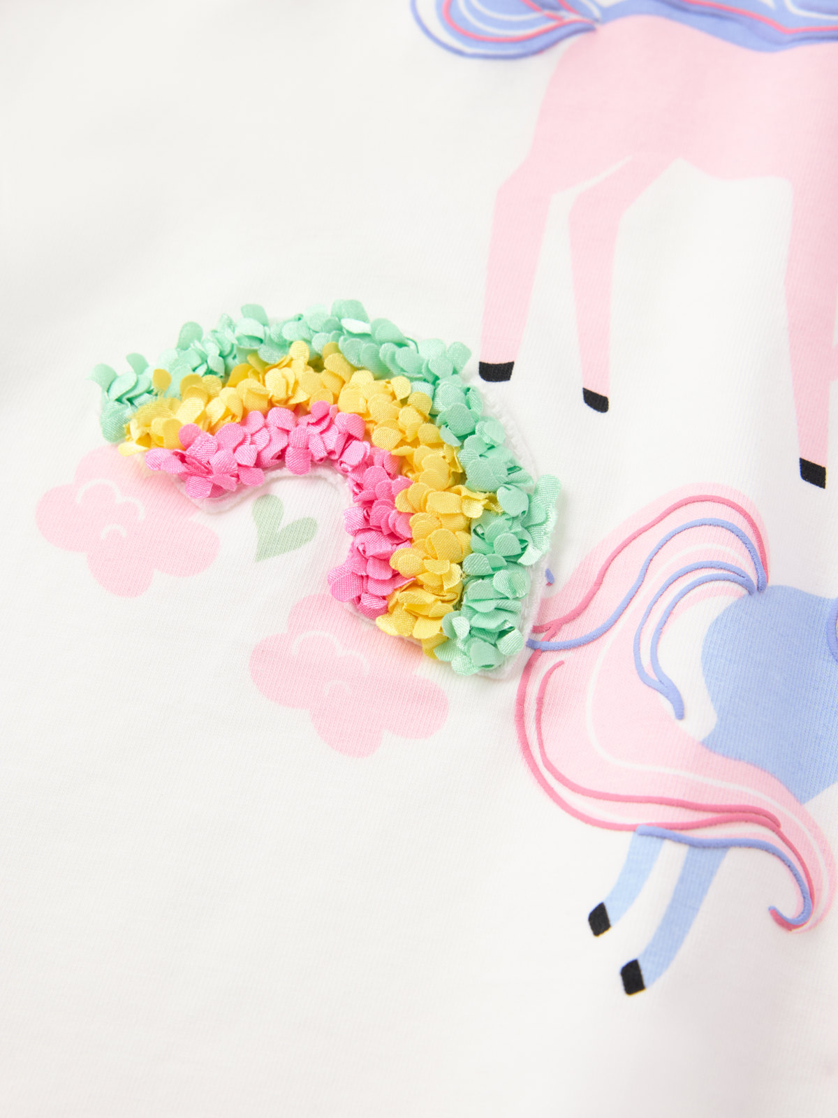 Ohut ja mukava paita pehmeää luomupuuvillatrikoota – pitkäikäinen suosikki! Neuleessa on suuri painatus, jossa on yksisarvisia ja sateenkaaria, ja sateenkaaret kohoavat kankaan pinnasta.