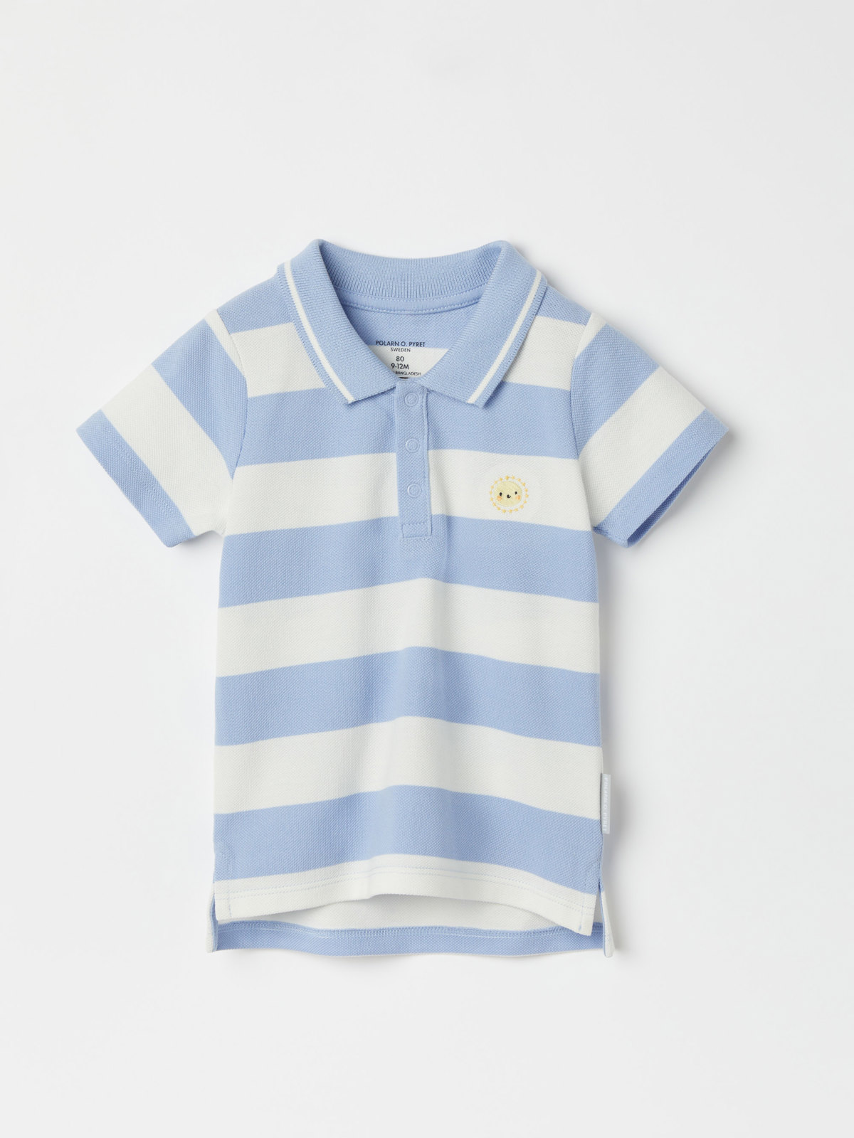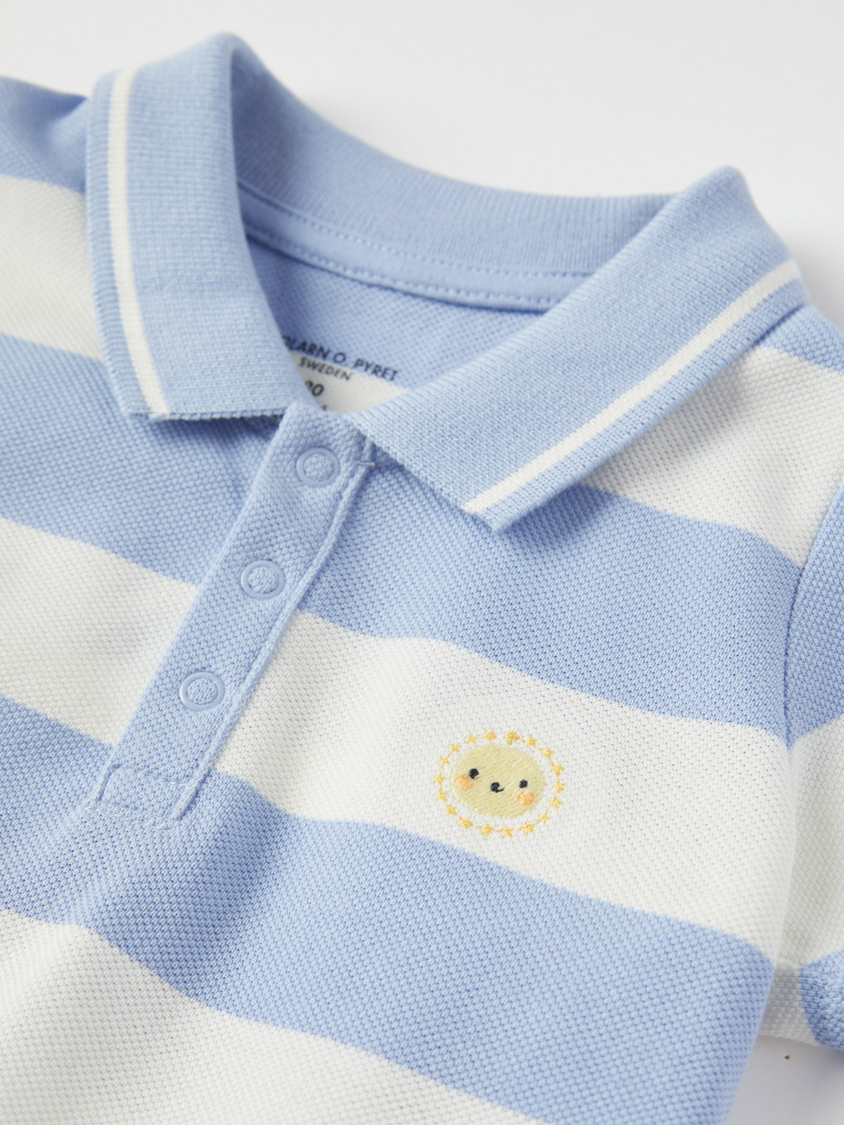 Vauvan lyhythihainen pikeepaita 100 % luomupuuvillaa. Palkkiraitaisessa paidassa on pieni kirjailtu aurinko rinnassa.