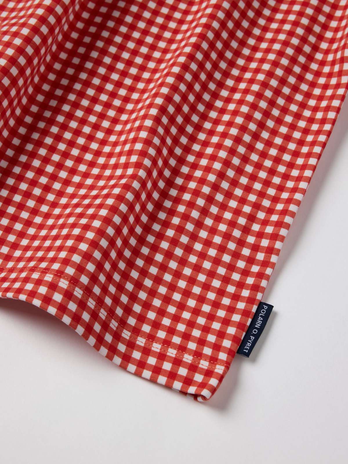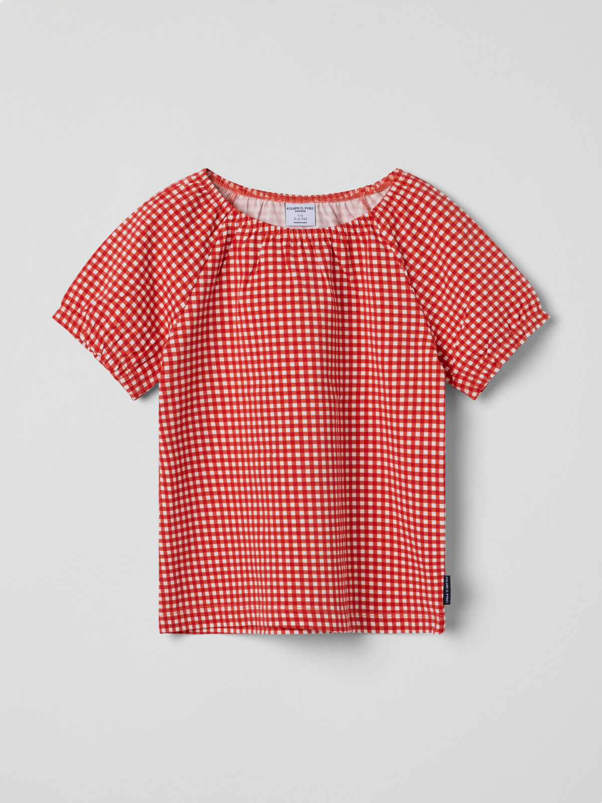 Suloinen ruudullinen paita luomupuuvillatrikoota. Kauniit puhvihihat – kesäsuosikki sekä arkeen että juhlaan! Paidan joustavissa hihansuissa on pienet röyhelöt.