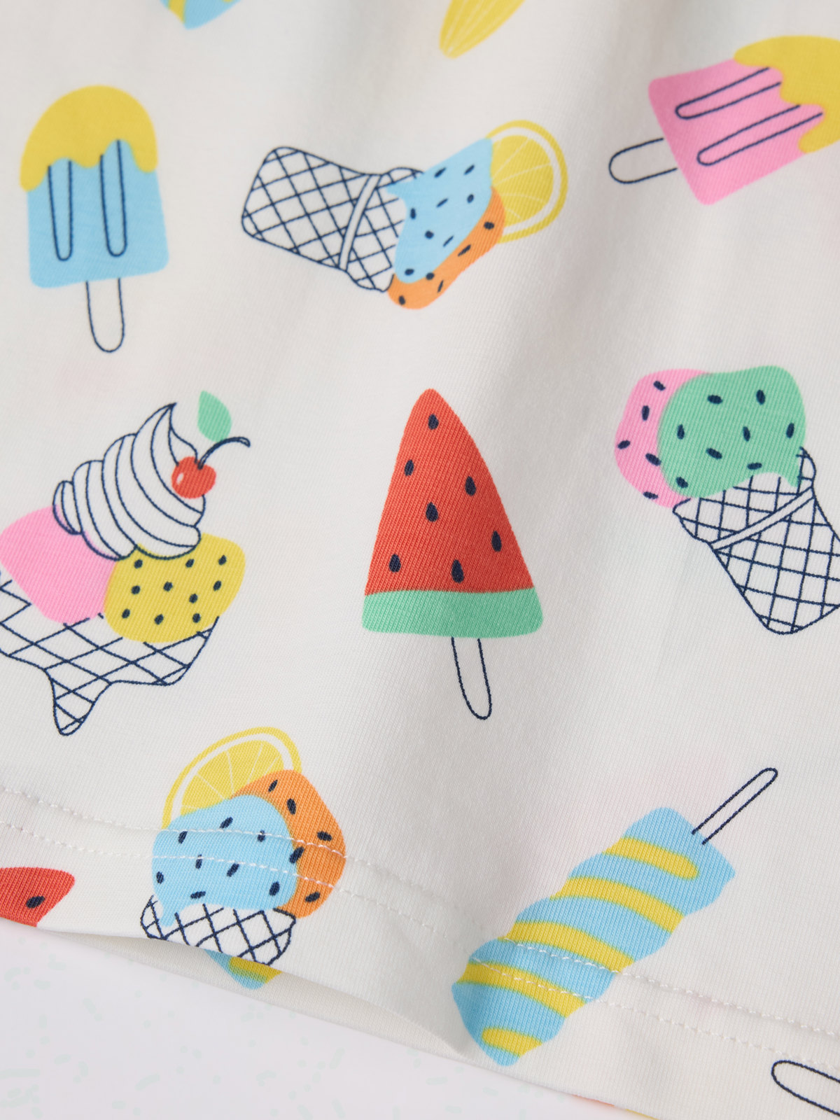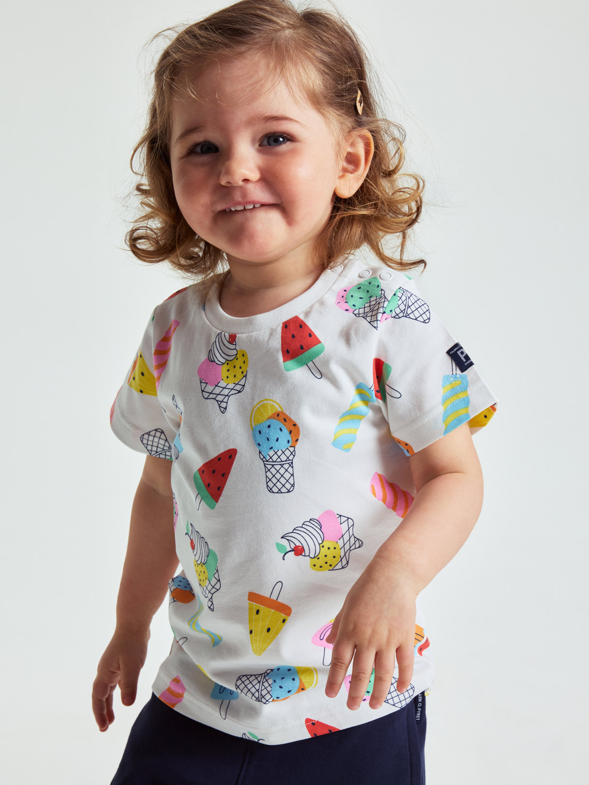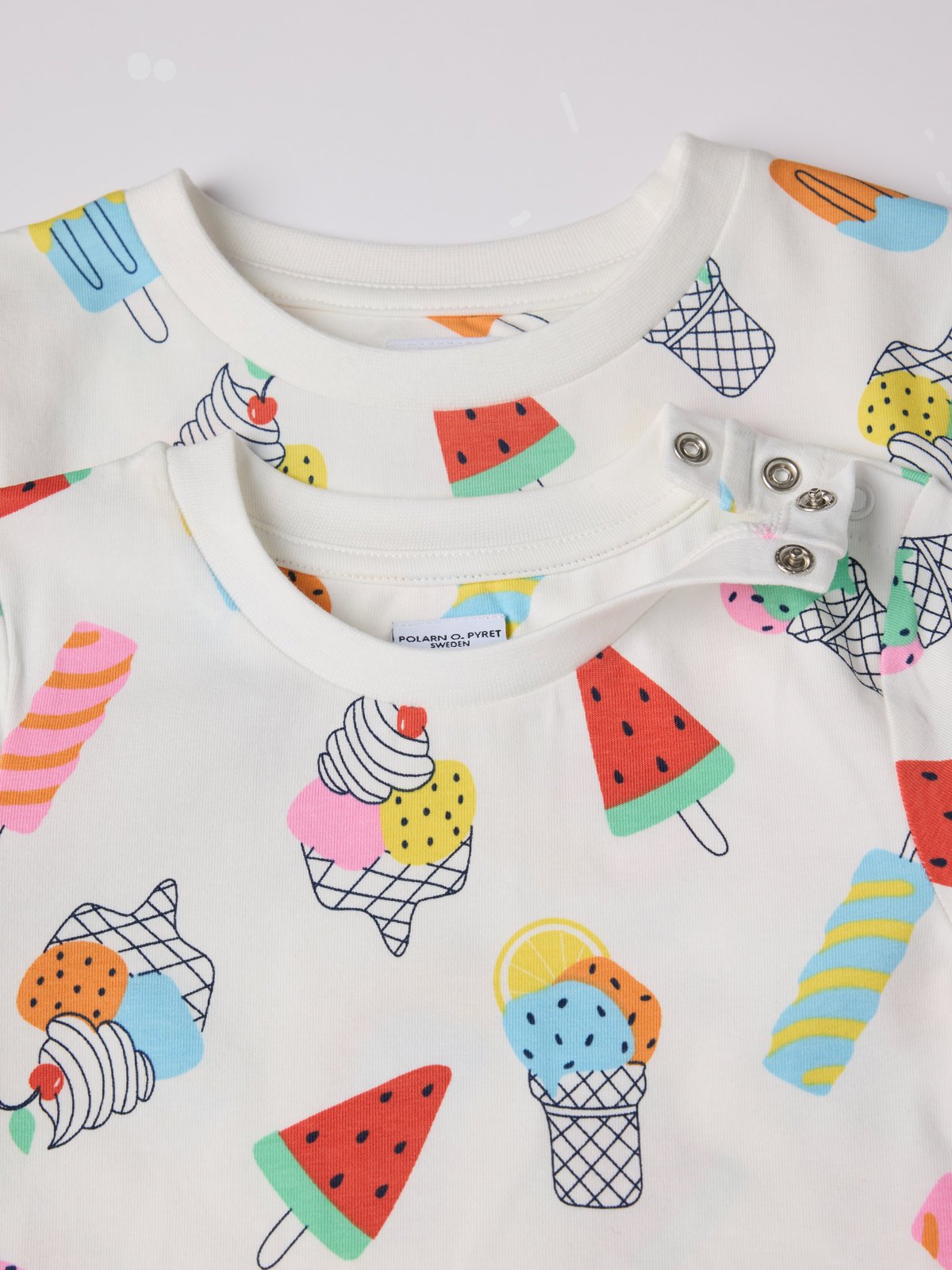 T-paita pehmeää luomupuuvillaa. Kuvioitu kokonaan jäätelökuviolla – pitkäikäinen kesäsuosikki, joka sopii kaikkiin tilanteisiin! Saatavilla useita värejä ja erilaisia kuvioita, jotka sopivat hyvin yhteen koko malliston kanssa. Löydä oma suosikkisi!