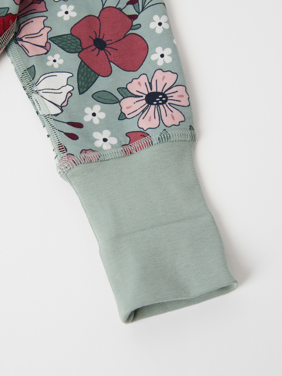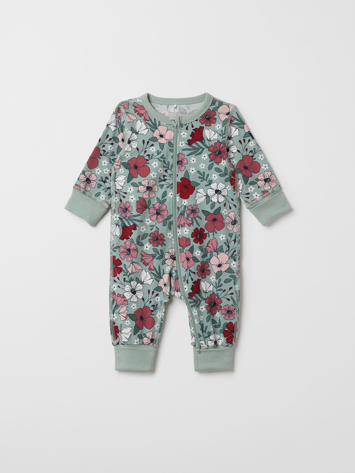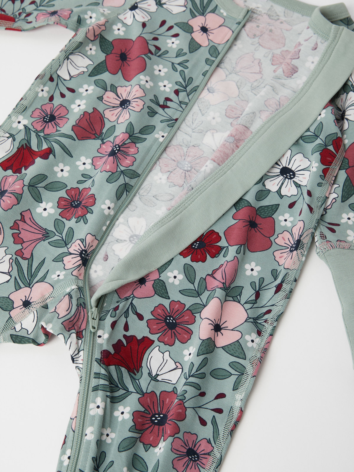 Pehmeä pyjamahaalari luomupuuvillaa. Kuvioitu kokonaan kukkakuviolla.