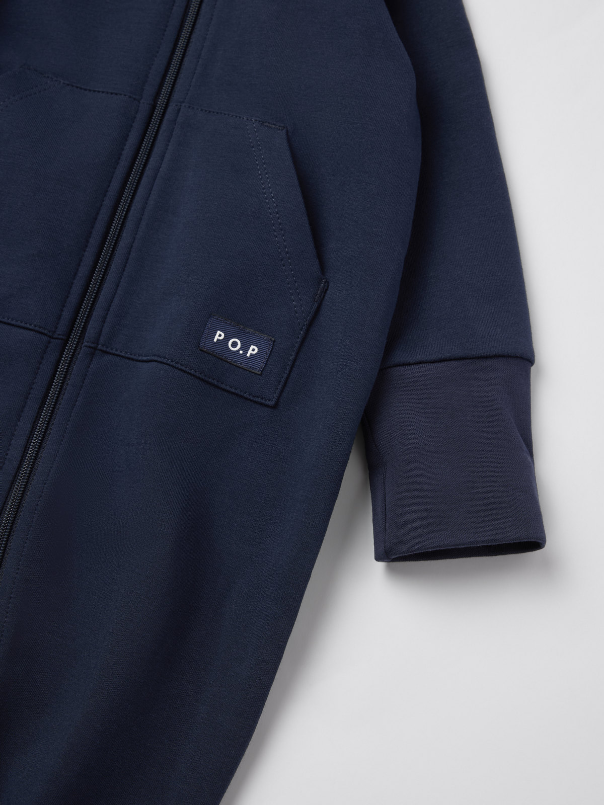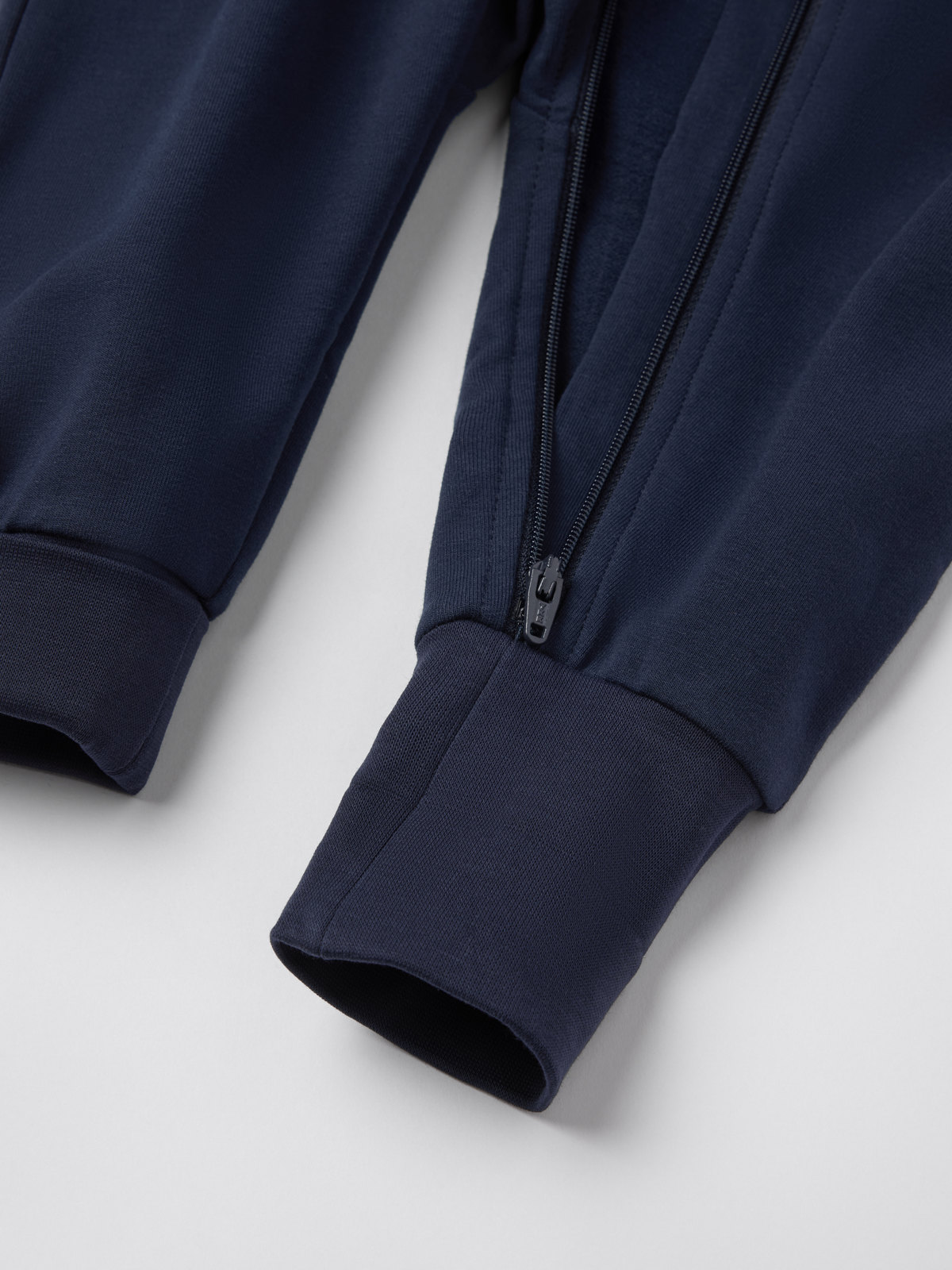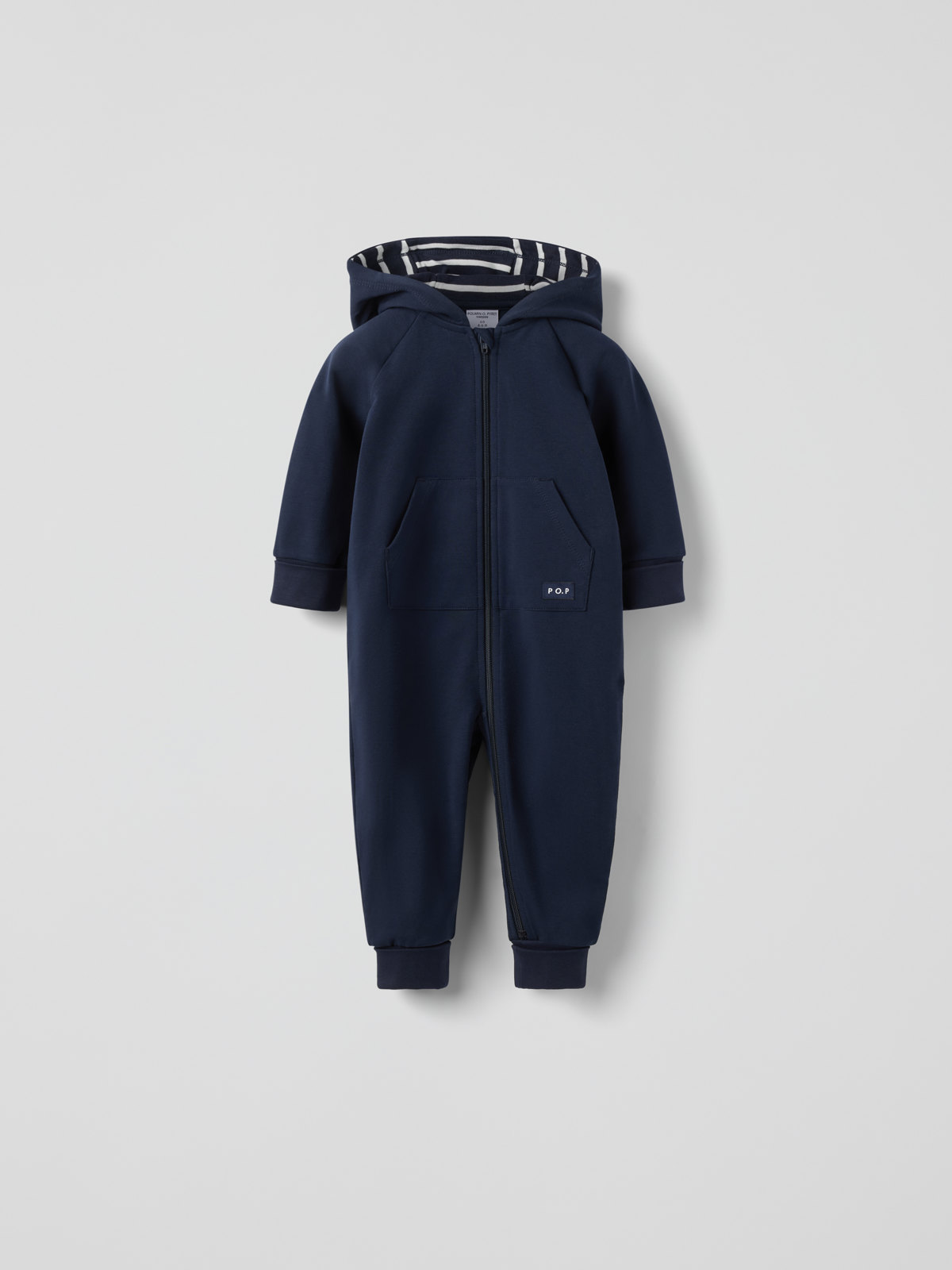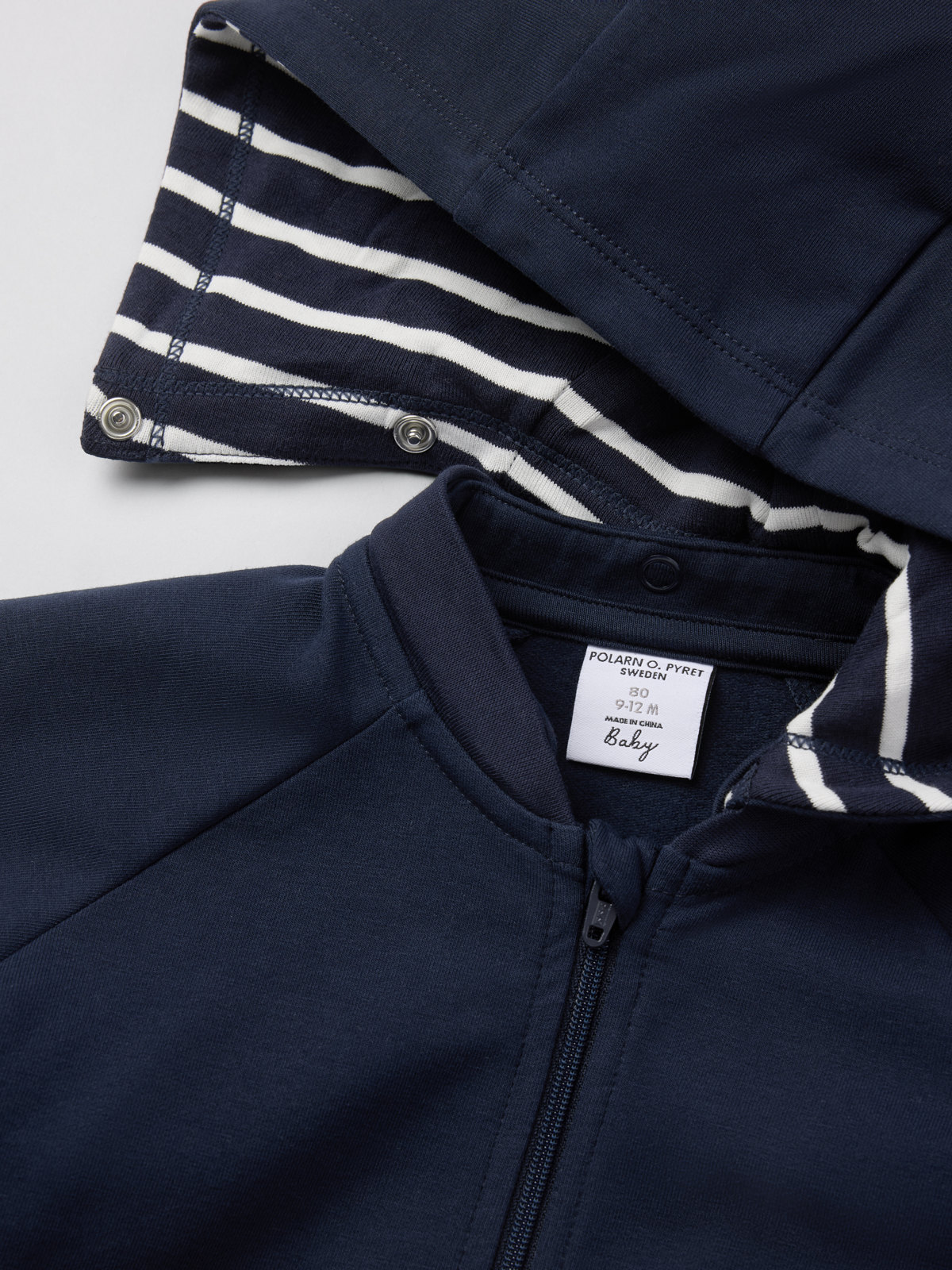 Vauvan pehmeä haalari luomupuuvillaa. Kaunista collegekangasta harjatulla sisäpinnalla. Haalarissa on kengurutasku. Kiinteän hupun vuori on pehmeää puuvillatrikoota, jossa on klassinen raitakuosimme. Pitkä vetoketju pääntieltä lahkeensuulle helpottaa pukemista. Vetoketjussa on suoja, jotta se ei hankaa leukaa ja poskia. Erittäin pitkät ribbiresorit hihan- ja lahkeensuissa voi taittaa alas lapsen kasvaessa.