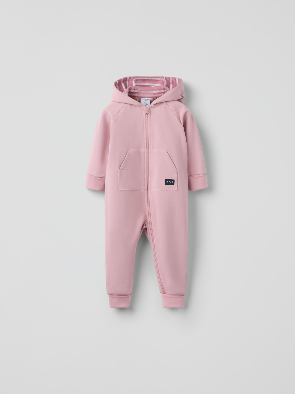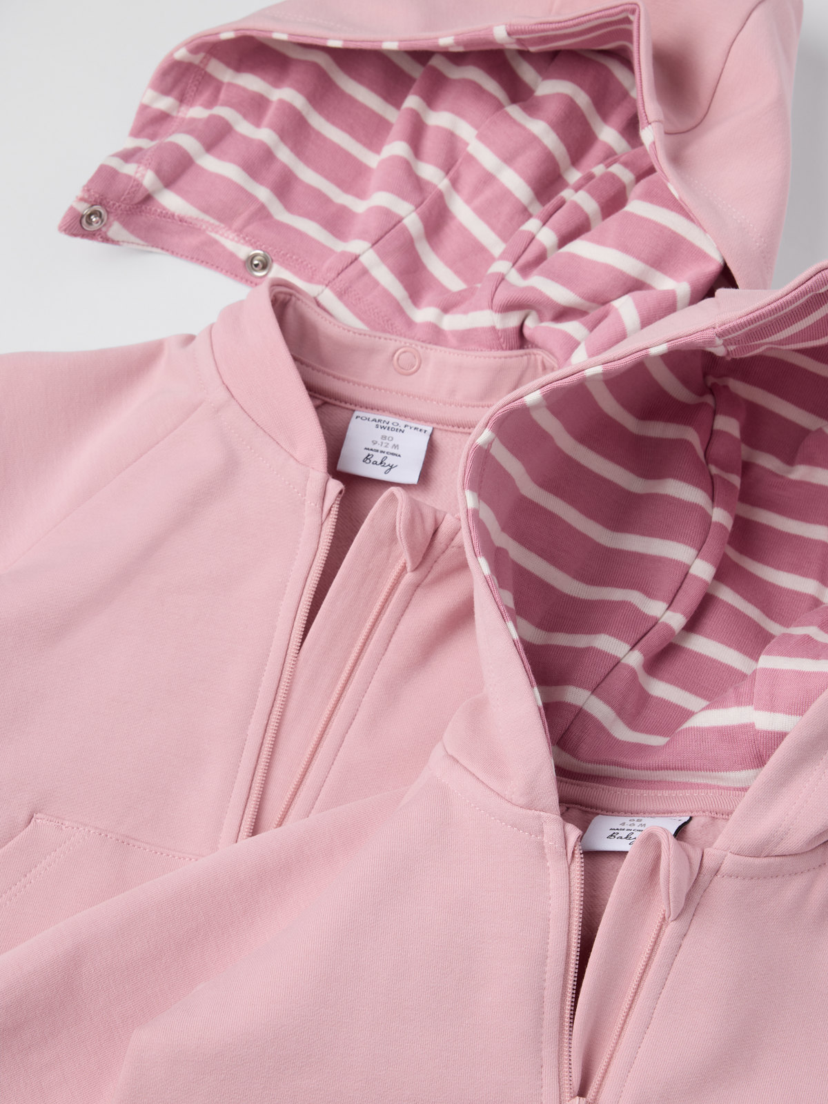 Vauvan pehmeä haalari luomupuuvillaa. Kaunista collegekangasta harjatulla sisäpinnalla. Haalarissa on kengurutasku. Kiinteän hupun vuori on pehmeää puuvillatrikoota, jossa on klassinen raitakuosimme. Pitkä vetoketju pääntieltä lahkeensuulle helpottaa pukemista. Vetoketjussa on suoja, jotta se ei hankaa leukaa ja poskia. Erittäin pitkät ribbiresorit hihan- ja lahkeensuissa voi taittaa alas lapsen kasvaessa.