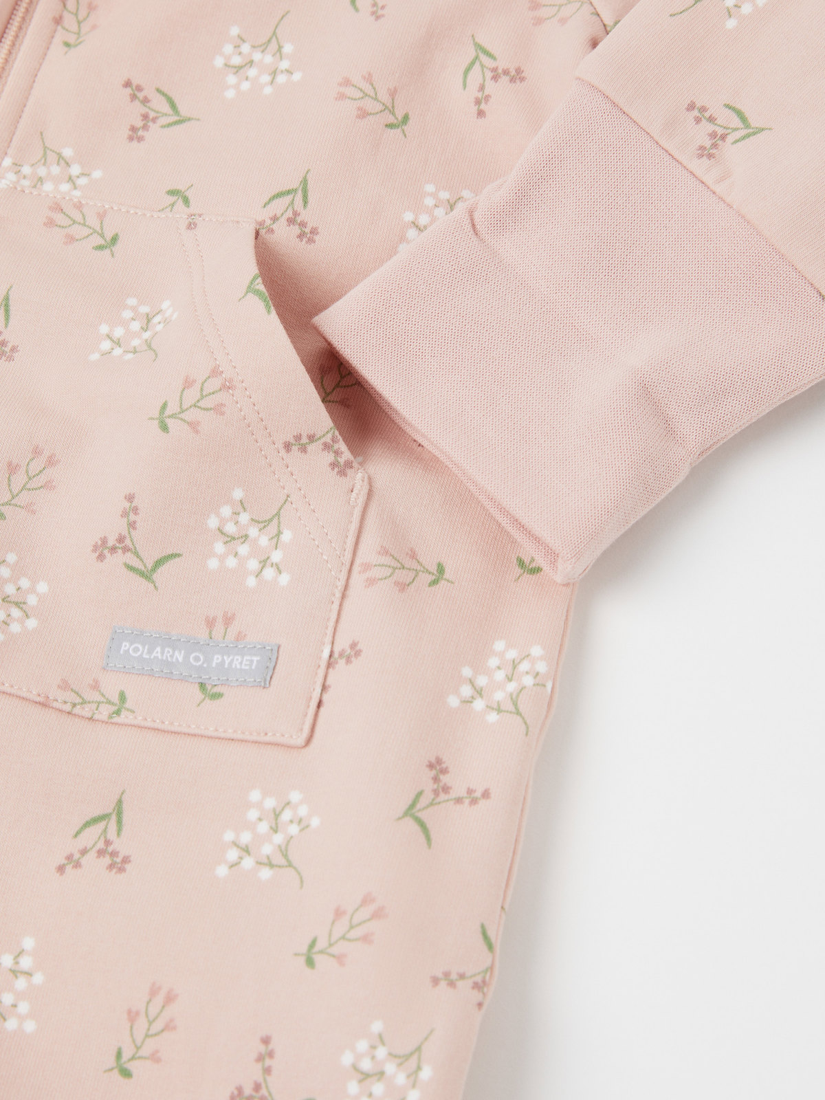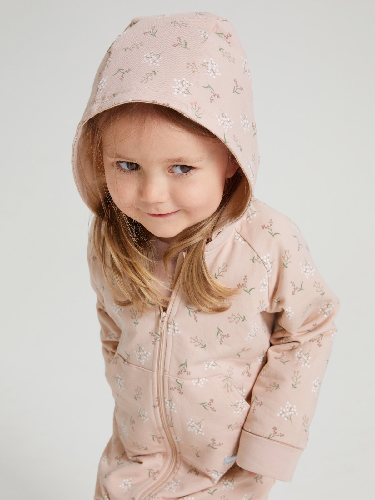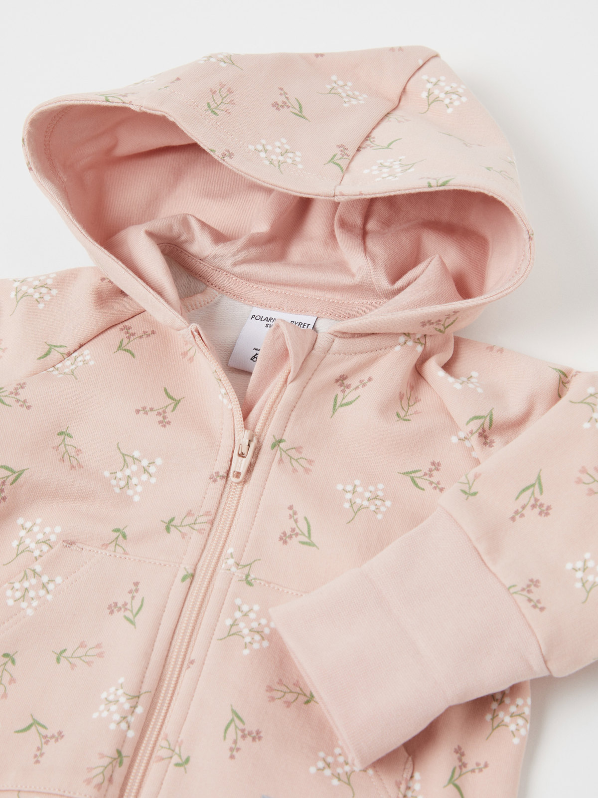Haalari on kuvioitu kokonaan kukkakuviolla. Kengurutasku ja kiinteä huppu, jossa on pehmeä puuvillatrikoovuori.
