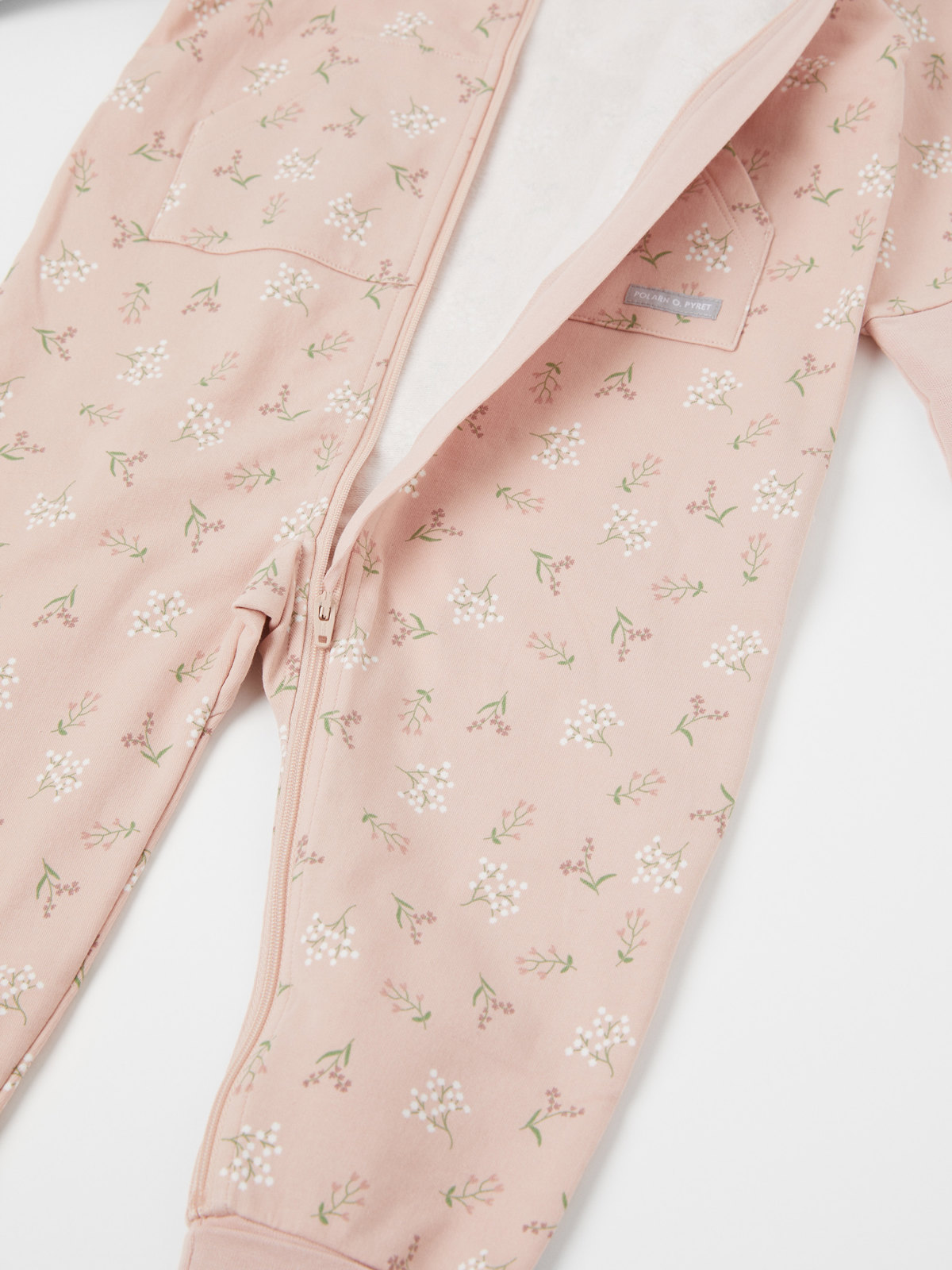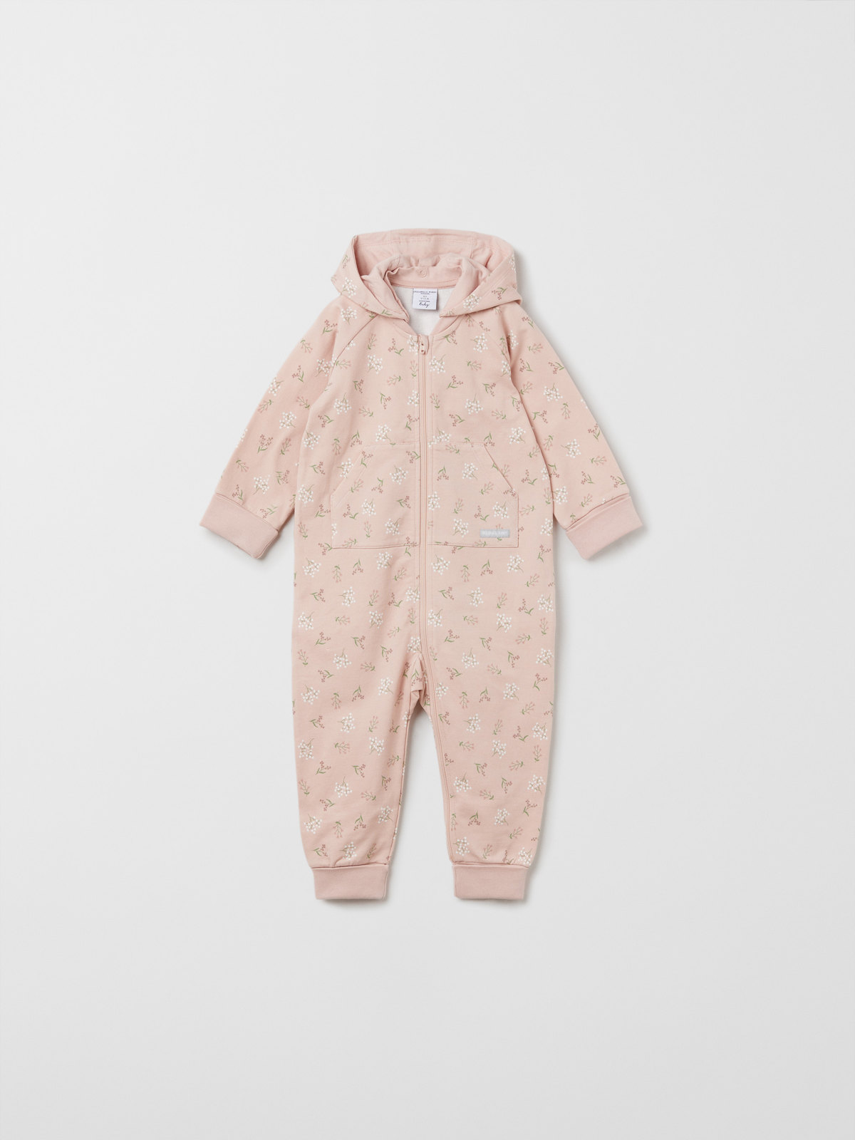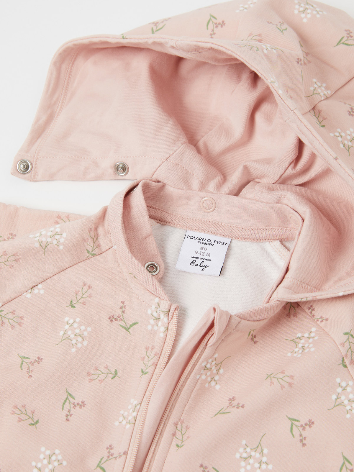 Haalari on kuvioitu kokonaan kukkakuviolla. Kengurutasku ja kiinteä huppu, jossa on pehmeä puuvillatrikoovuori.