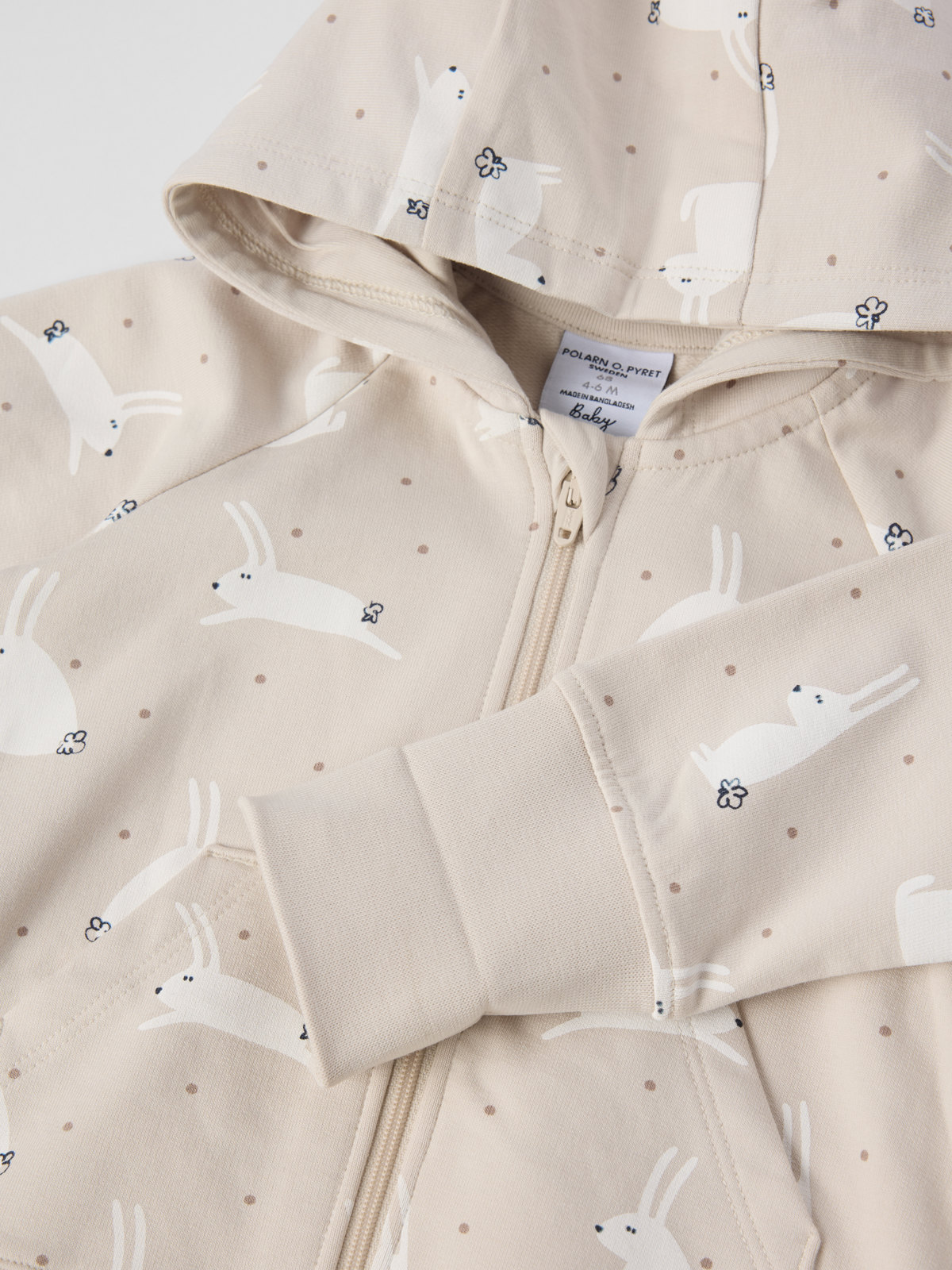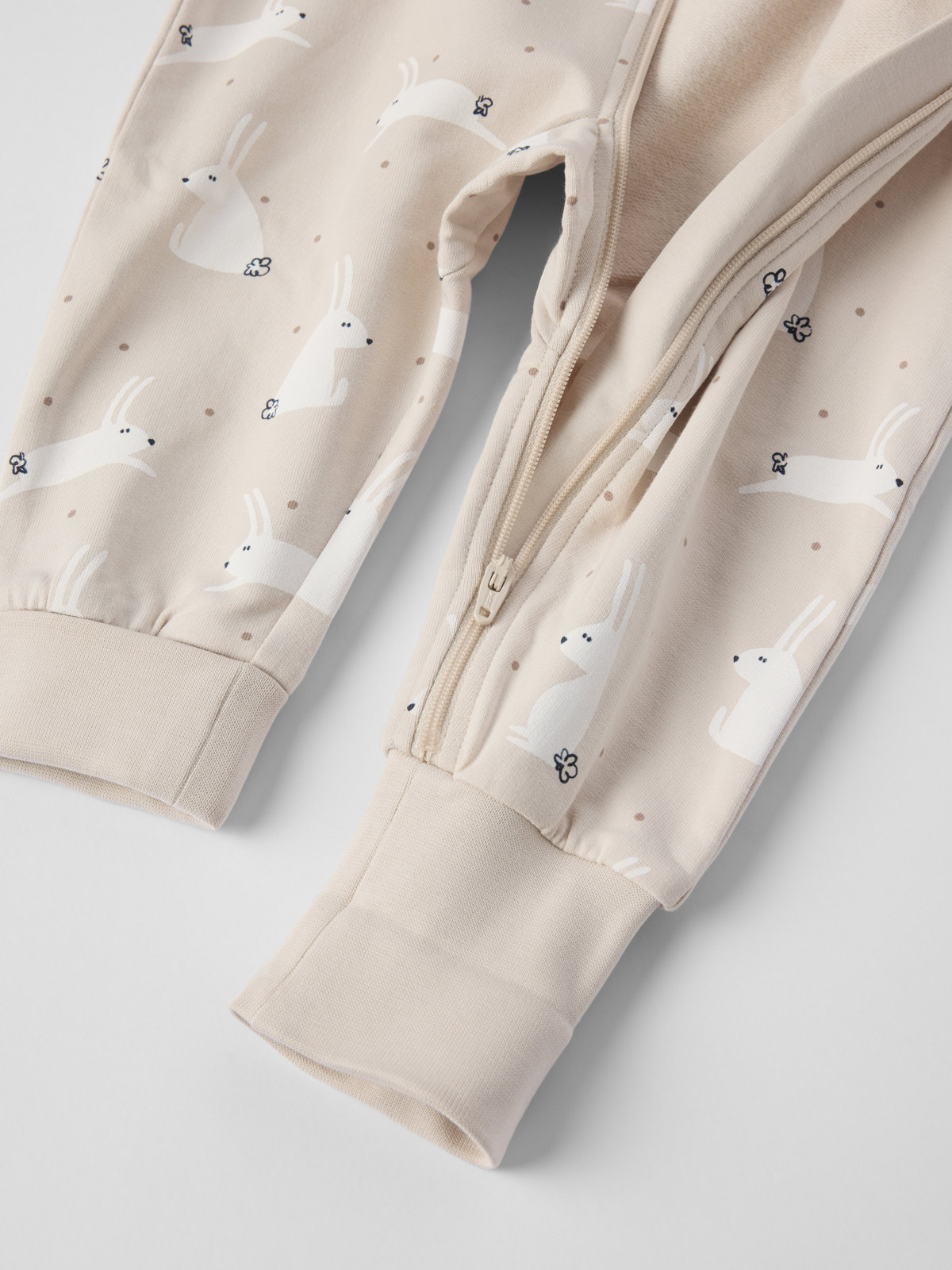 Vauvan pehmeä haalari luomupuuvillaa. Kaunista collegekangasta harjatulla sisäpinnalla. Haalarissa on kengurutasku. Kiinteän hupun vuori on pehmeää puuvillatrikoota, jossa on klassinen raitakuosimme. Pitkä vetoketju pääntieltä lahkeensuulle helpottaa pukemista. Vetoketjussa on suoja, jotta se ei hankaa leukaa ja poskia. Erittäin pitkät ribbiresorit hihan- ja lahkeensuissa voi taittaa alas lapsen kasvaessa.