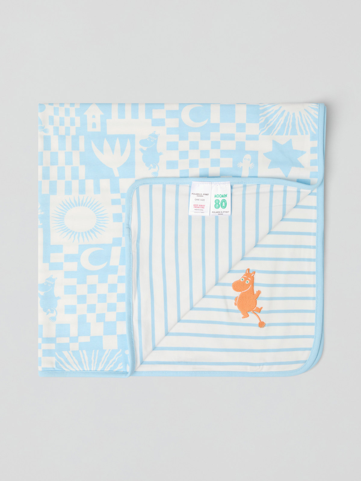 Pehmeä ja kaunis vauvan viltti luomupuuvillaa. Kuvitus Tove Janssonin muumitarinoista. Täydellinen vaunuihin tai kotiin.