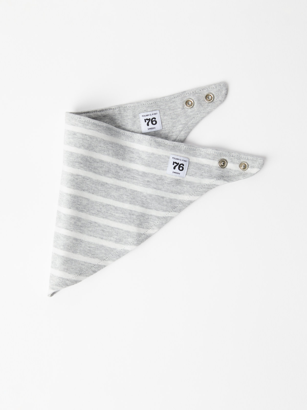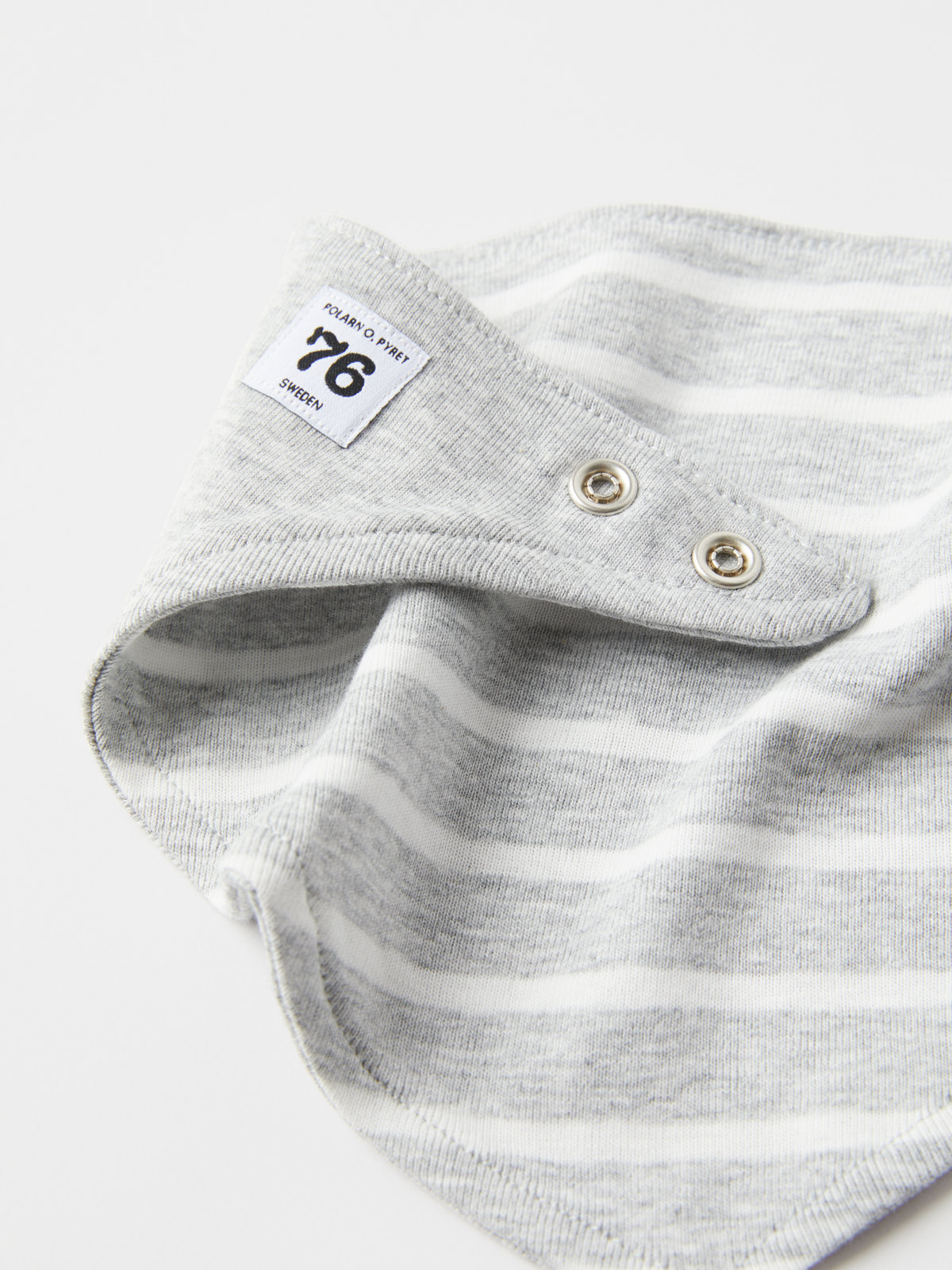 Vauvan käännettävä kaulalappu pehmeää trikoota. Kaulalappu suojaa vaatteita ja on valmistettu 100 % luomupuuvillasta. Toisella puolella on klassinen raitakuosimme, toinen puoli on yksivärinen. Kaulalapun kokoa voi säätää neppareilla.
