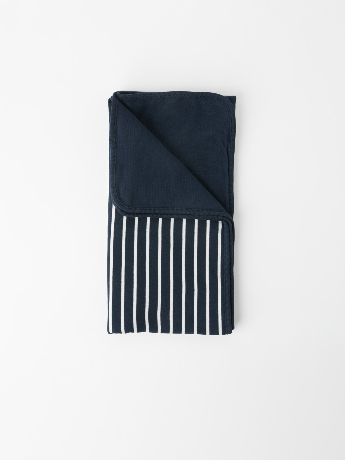 Viltti luomupuuvillaa Polarn O. Pyret -raitakuosilla. Toinen puoli yksivärinen. Koko: 84 x 84 cm.