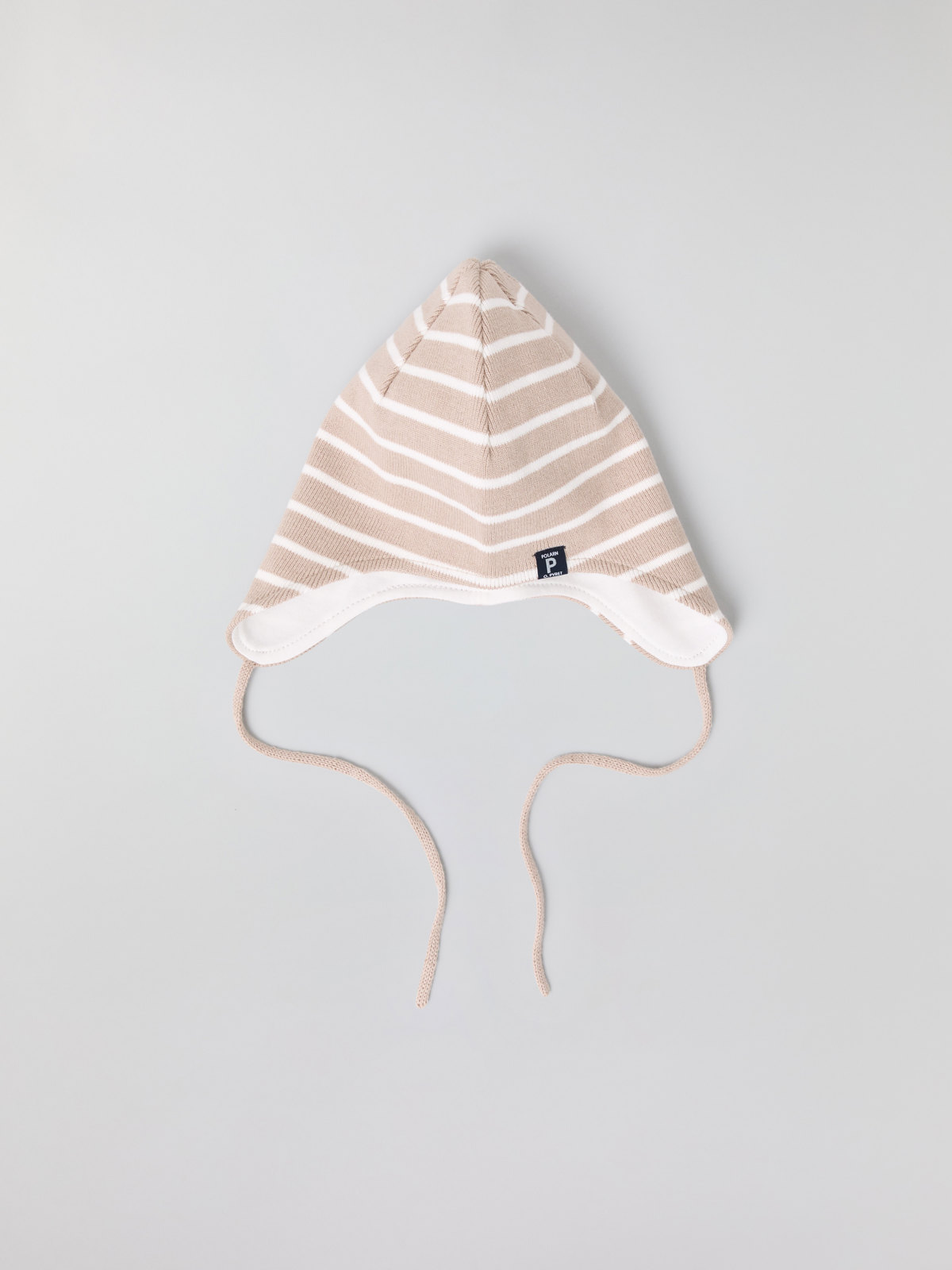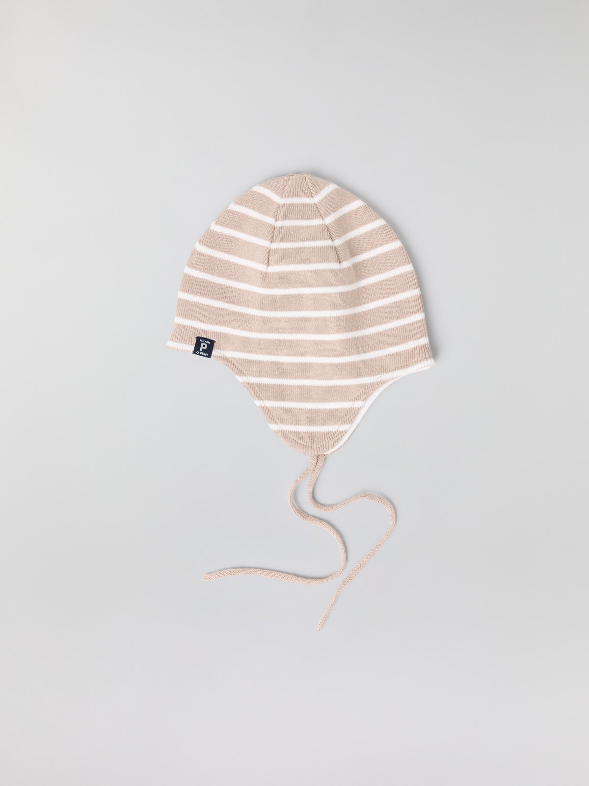 Pipossa on klassinen raitakuosimme ja se peittää korvat mukavasti. Pehmeät solmittavat nauhat pitävät pipon paikallaan.
