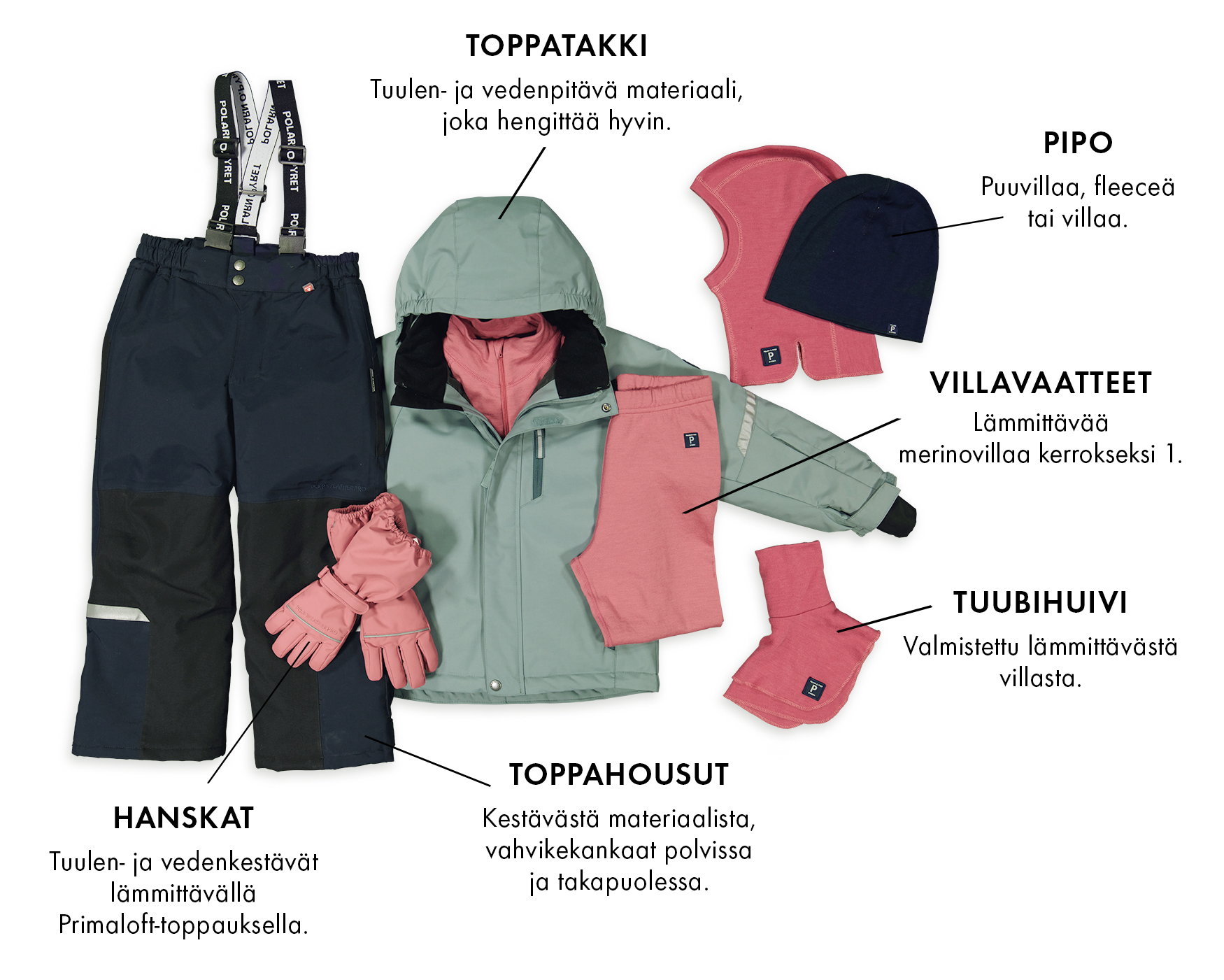 - Kerros 3 - perheen pienokaisille suosittelemme toppahaalaria päällimmäiseksi kerrokseksi. Hieman vanhemmille lapsille, jotka viilettävät vauhdikkaasti aamusta iltaan, suosittelemme toppatakkia sekä -housuja. Osassa takkimalleistamme on myös kätevä tasku hissilipulle! Housuissa säädettävät lahkeet helpottavat monojen laittamisessa jalkaan. Myös heijastimien riittävä määrä on suunnitteluvaiheessa otettu tarkasti huomioon.