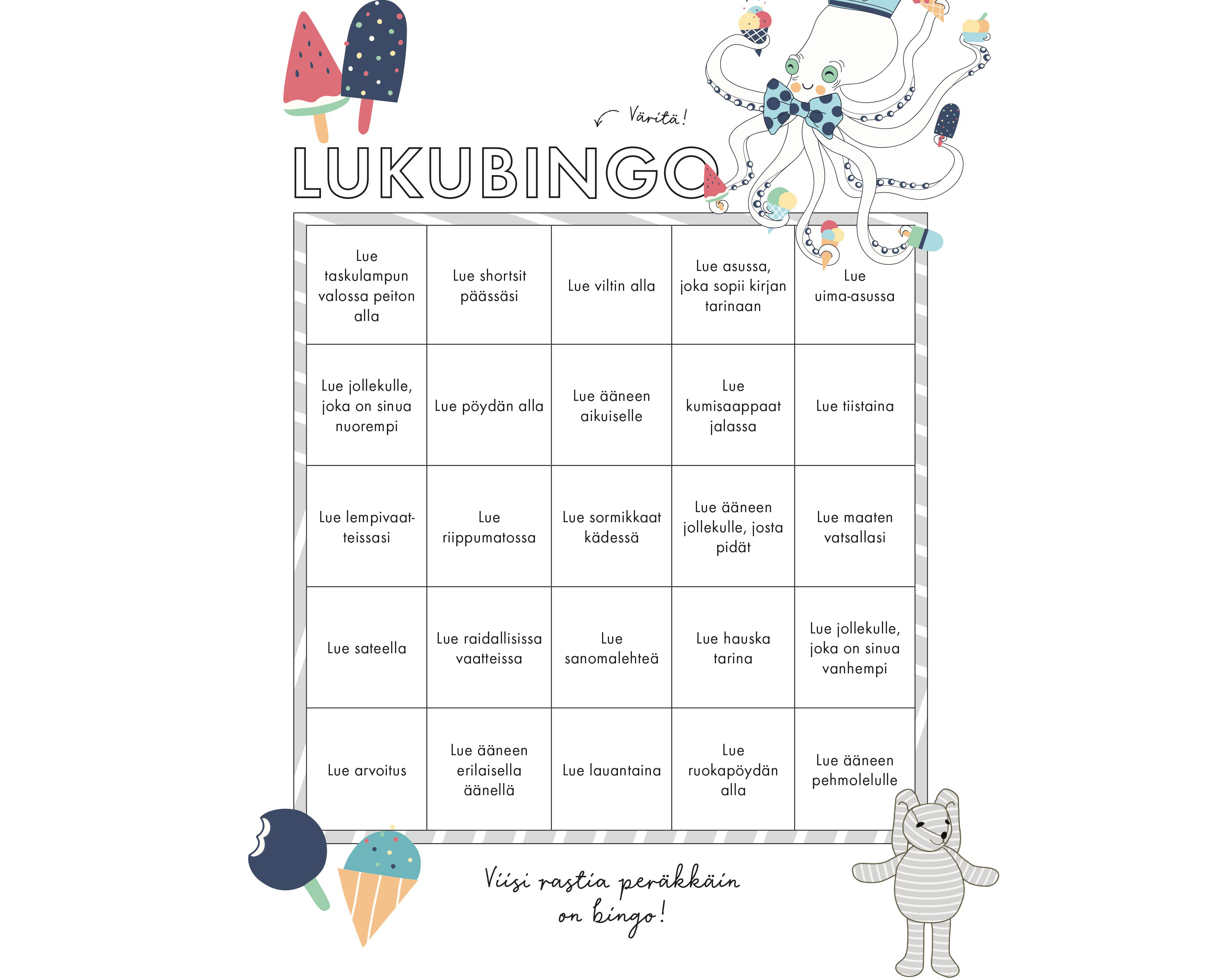 Innosta ja rohkaise lapsia harjoittelemaan lukemista tänä kesänä Polarn O. Pyretin uuden lukubingon avulla! Tulosta bingolauta ja lue vähintään kymmenen minuuttia saadaksesi rastin ruutuun — kun saat viisi rastia peräkkäin, saat bingon. Ehkäpä bingon huutanut lapsi saa palkinnoksi tutkintotodistuksen, jäätelön tai jonkin muun kesäisen palkinnon? Vain mielikuvitus on rajana!