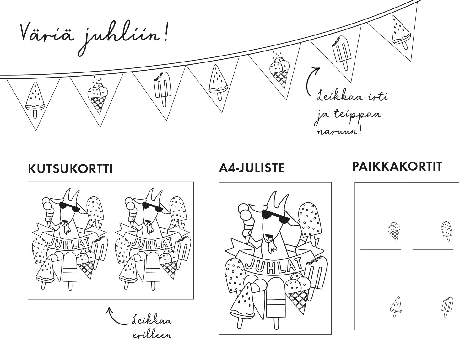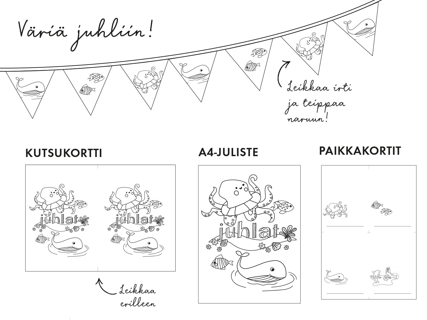 Kutsu perhe, kaveri tai pupu juhliin tänä kesänä! Olemme keränneet kutsukortteja, viirejä, paikkakortteja ja julisteita, jotka voit tulostaa ja värittää oikean tunnelman luomiseksi.